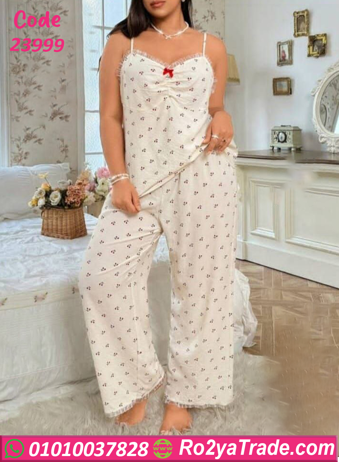 الخامة ناعمة جدًا على الجسم وتديكي إحساس بالراحة طول اليوم، التصميم فيه لمسة أنوثة ناعمة بنقشة منقطه صغيرة، والتوب مزين بدانتيل أبيض مع فيونكة حمرا صغيرة بتدي شكل جذاب جدًا.
