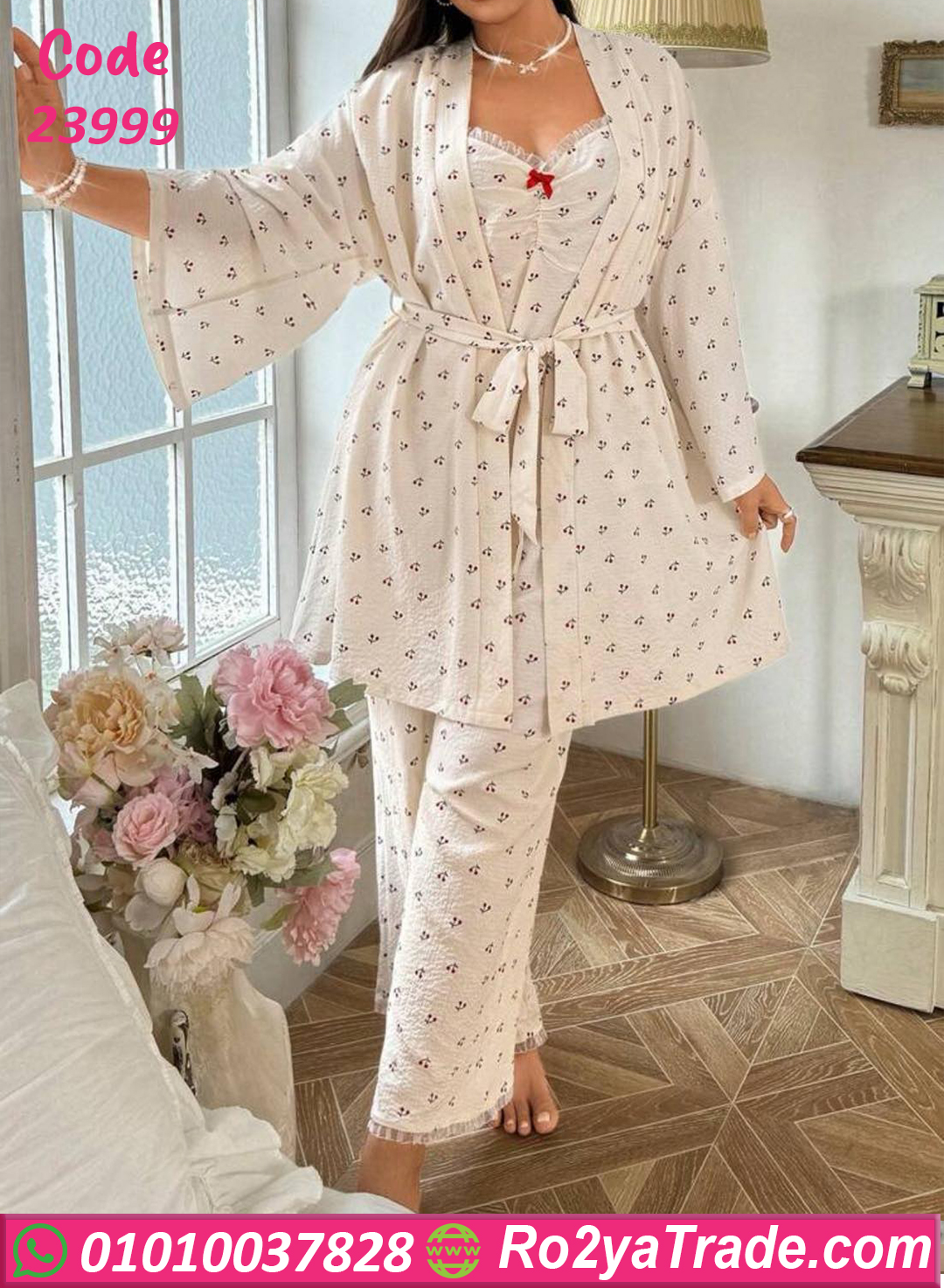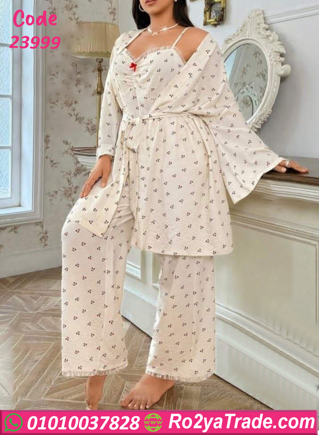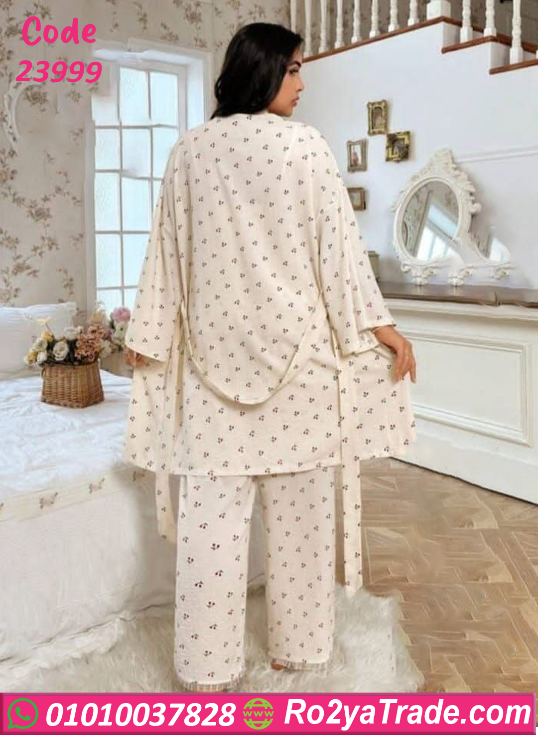 طقم أنيق من LARA بيتكون من 3 قطع (توب دانتيل + بنطلون واسع + روب خفيف)، خامة ناعمة ودافية ومريحة جدا