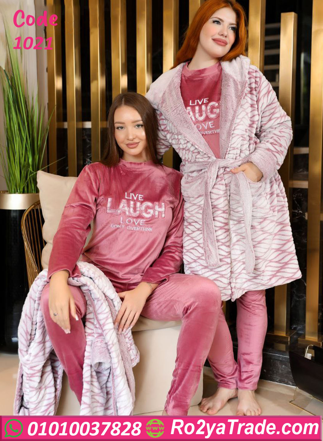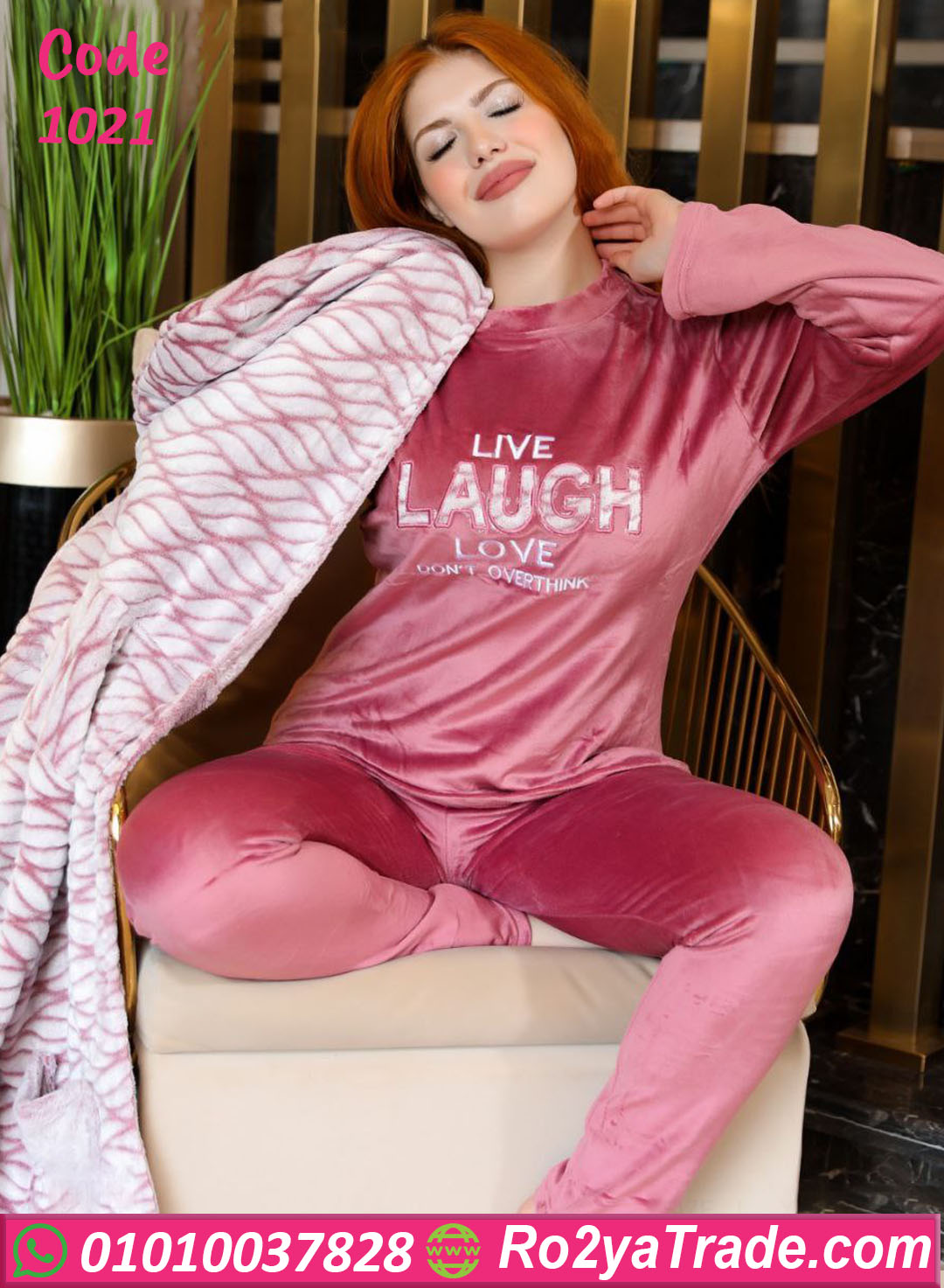 الطقم مكوّن من 3 قطع: جاكيت فرو ناعم بكابيشو وجيوب مريحة، وتوب قطيفة مطبوع بعبارة Live, Laugh, Love بيضيف لمسة أنوثة رقيقة، مع بنطلون قطيفة بنفس اللون بيكمل الطقم بشكل متناسق جدًا.