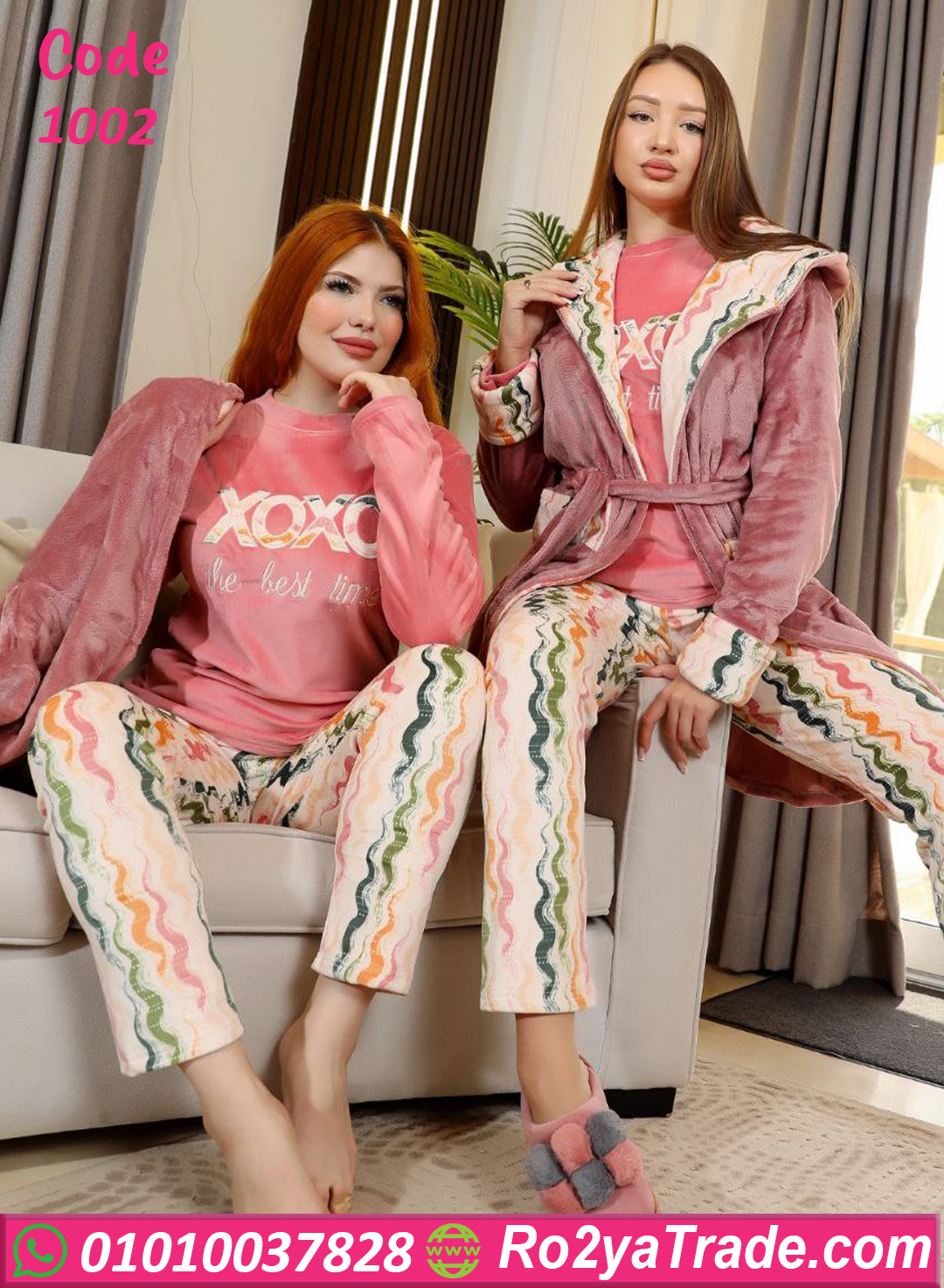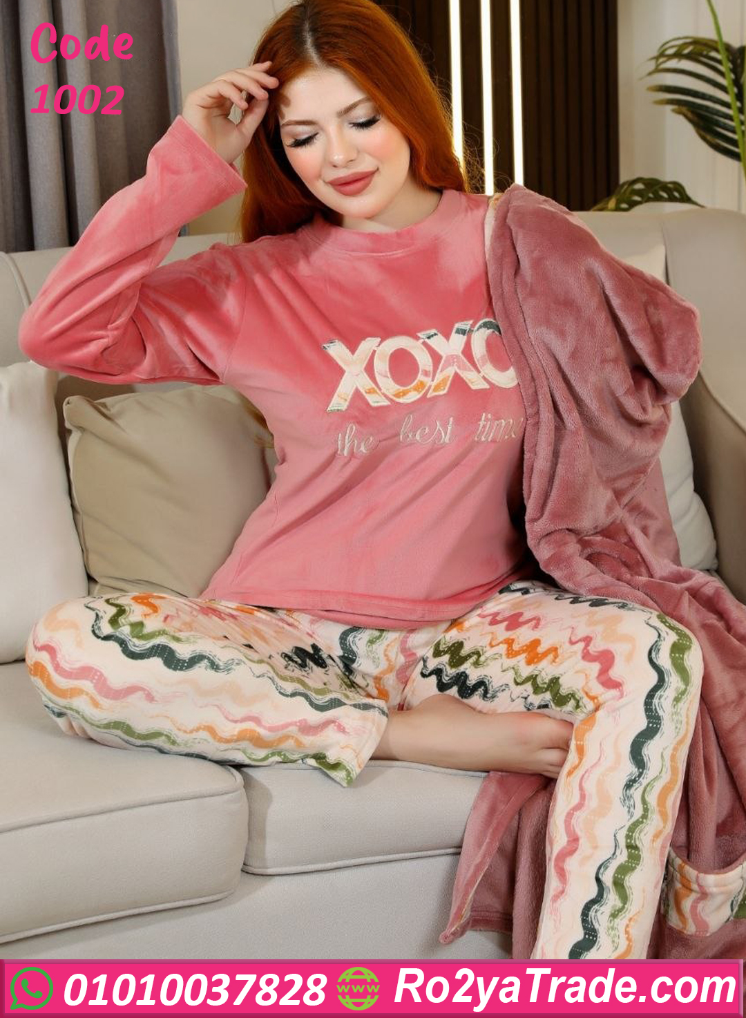 طقم شتوي قطيفة ناعم مكوّن من 3 قطع: بلوزة + بنطلون + روب بكابيشو خامة مريحة ودافية