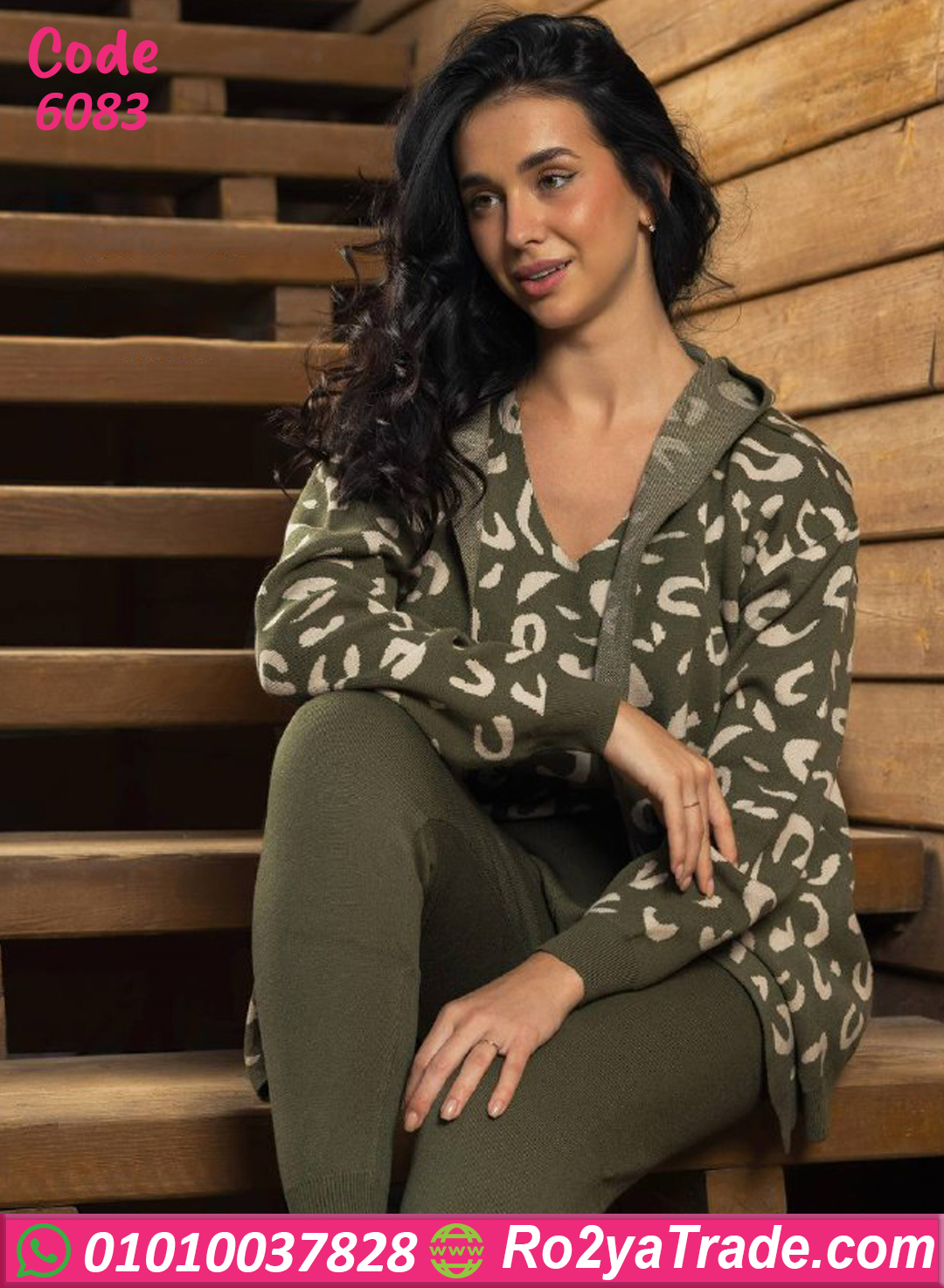 معمول من خامة تريكو طرية ومريحة جدًا على الجسم، جاكيت كارديجان واسع بنقشة ليوبارد أنيقة، وتوب وبنطلون بنفس اللون في تناسق شيك يخلي إطلالتك مميزة حتى في الأيام الباردة ❄️