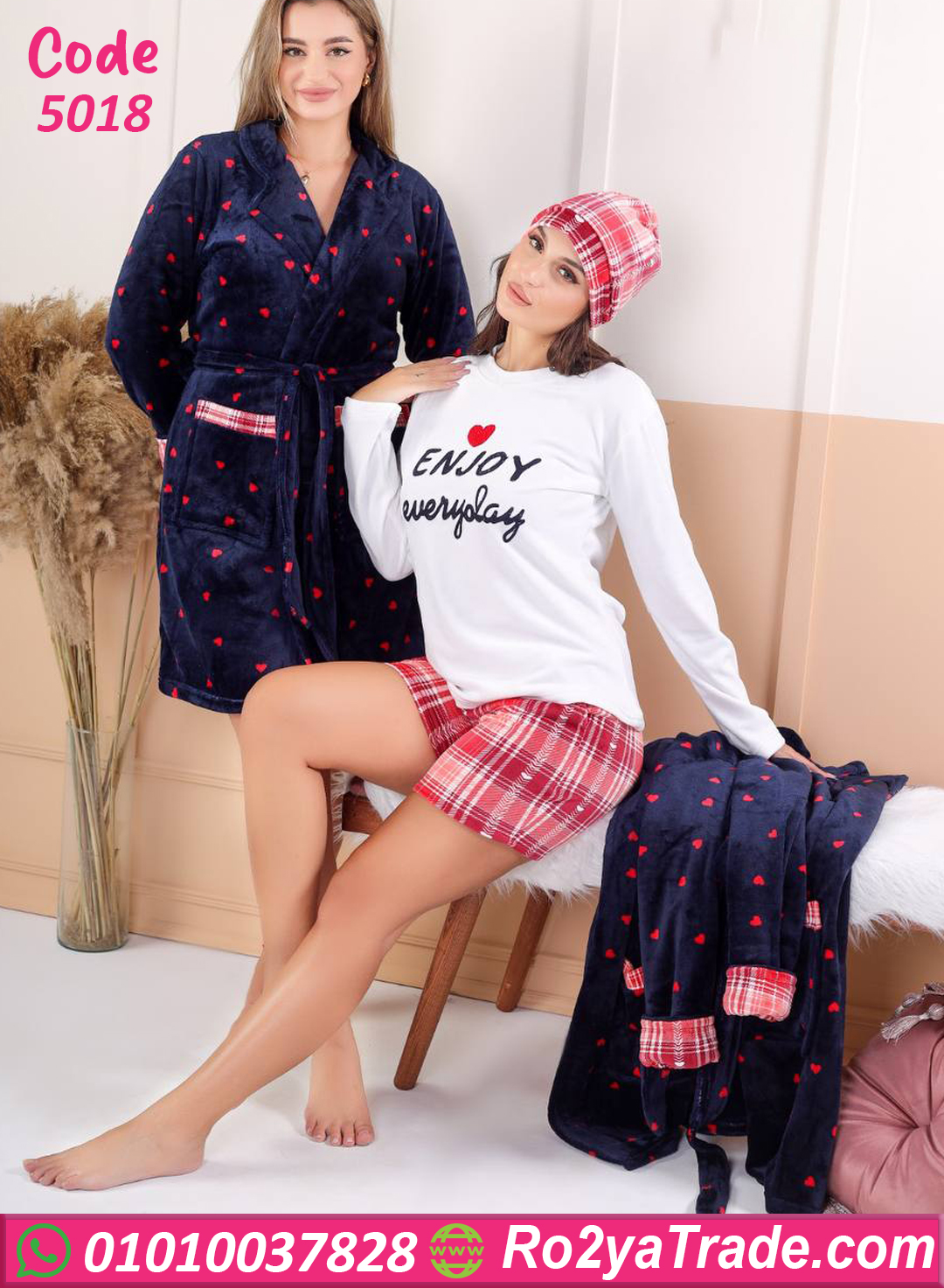 ومعاه روب بنفس اللون الكحلي المزين بقلوب صغيرة أحمر تضيف لمسة حب وأنوثة.
