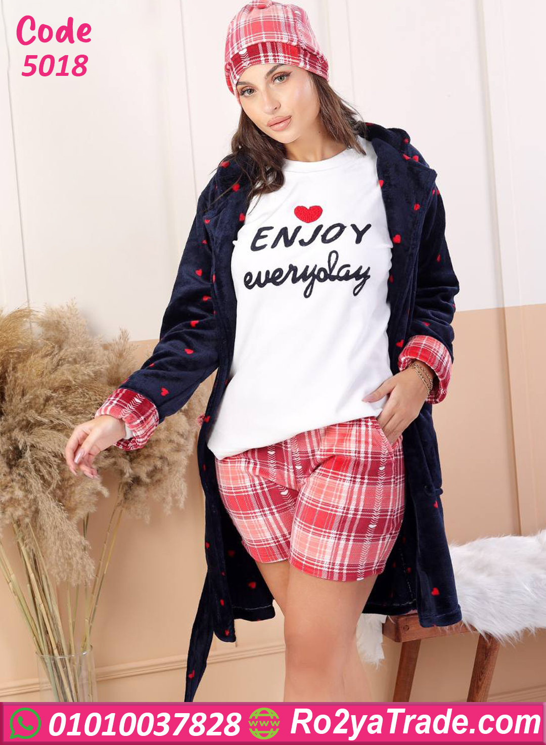 طقم شتوي ناعم ومميز بخامة قطيفة فخمة، فيه هوت شورت بكاروهات شيك، وتيشيرت أبيض مطبوع، ومعاه روب بنفس النقشة الغامقة،