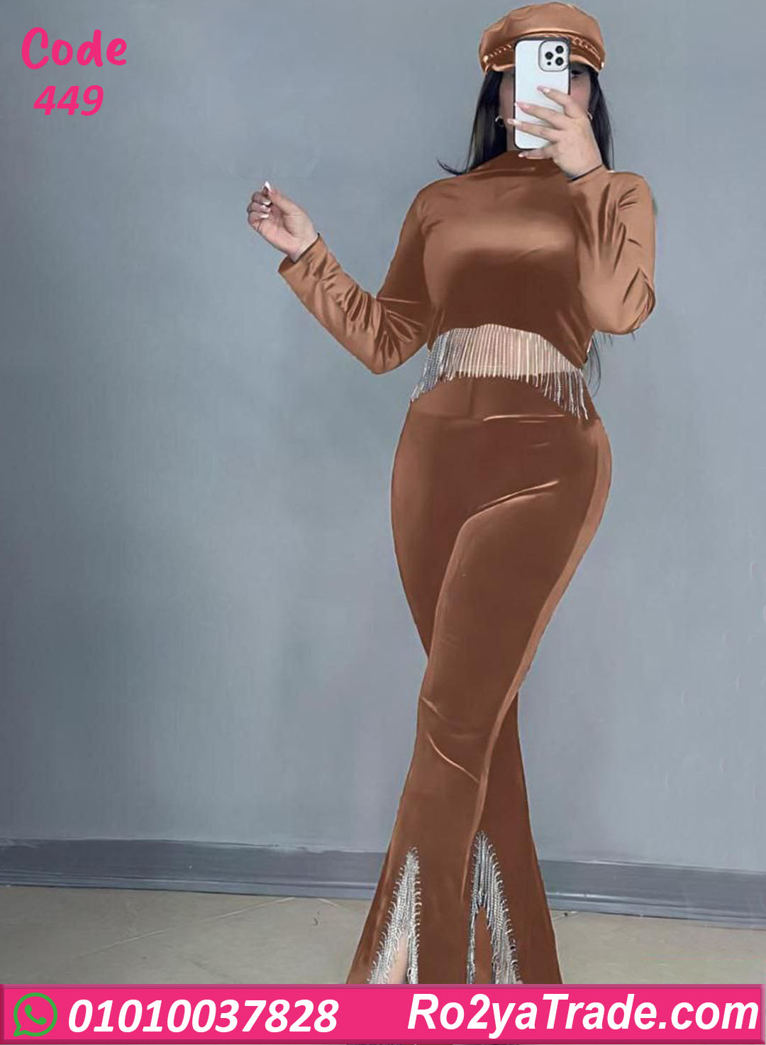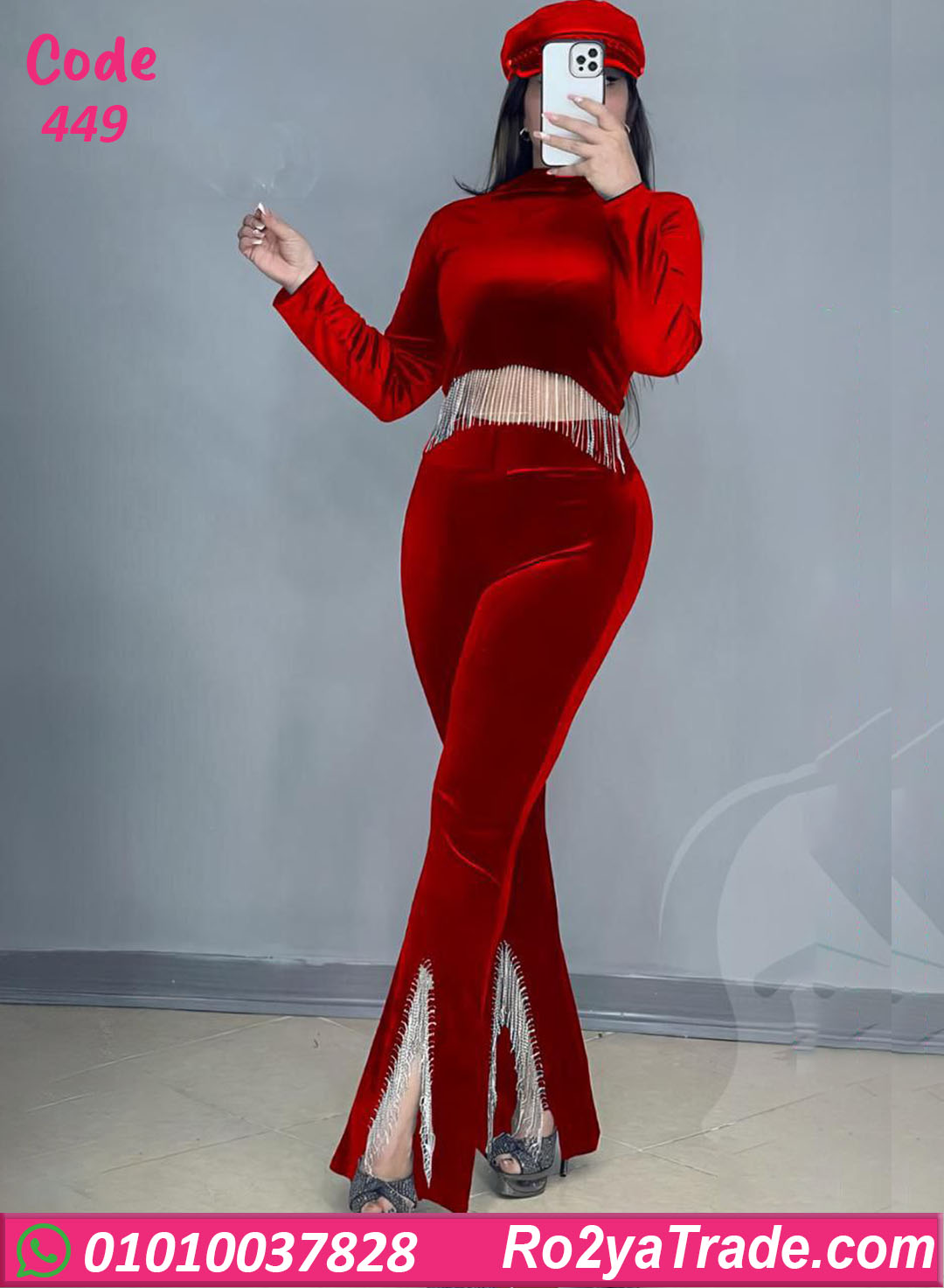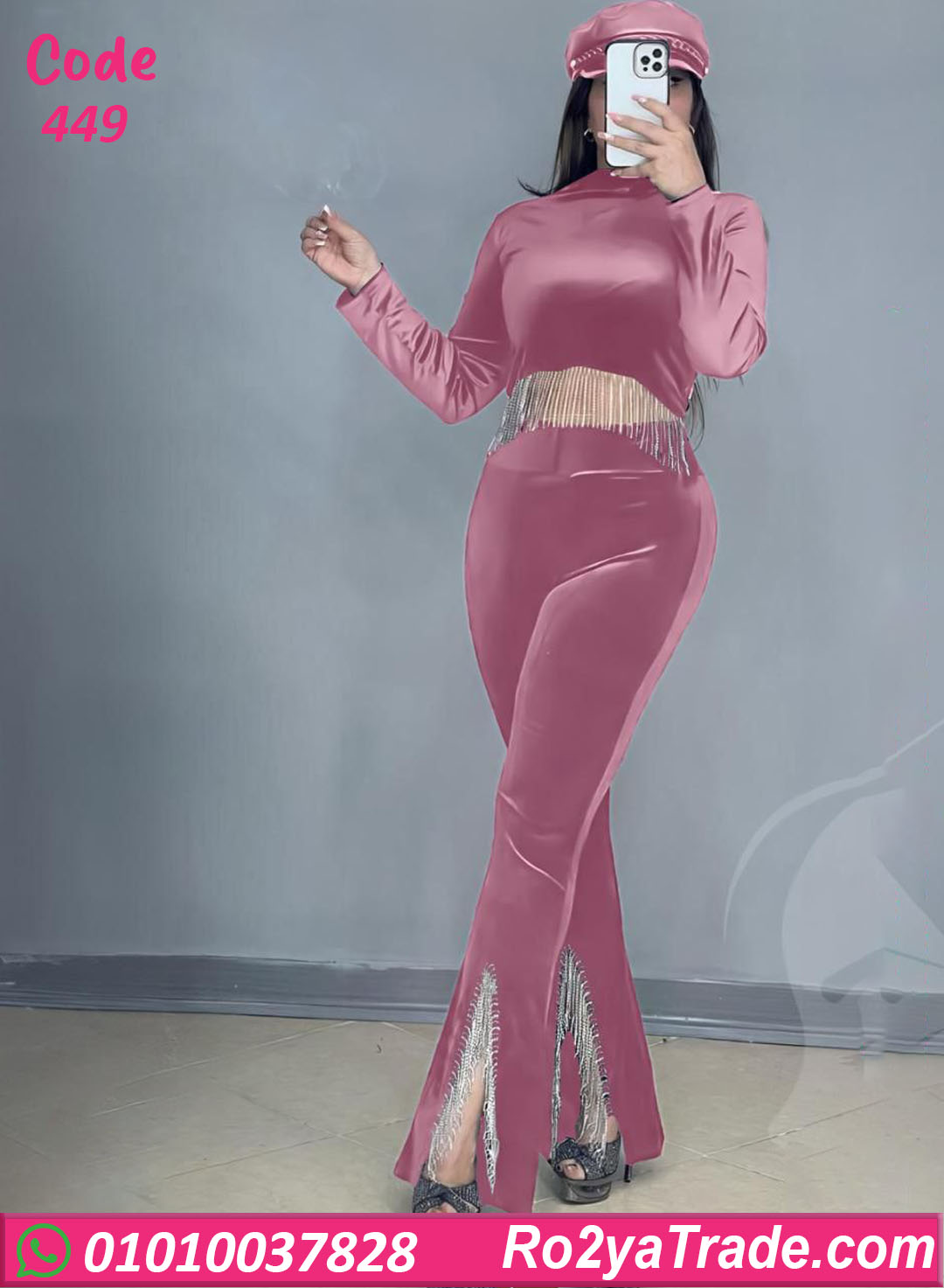 لو بتدوري على طقم شتوي عملي وفي نفس الوقت شكله شيك، فـ طقم القطيفة ده اختيار ممتاز. الموديل مكوّن من قطعتين، بلوزة بأكمام طويلة بتصميم عصري ولمسة كريستال عند الخصر بتدي شكل مختلف وجذاب، مع بنطلون قطيفة بقصة مريحة ومفتوحة من أسفل بتفاصيل لامعة بتكمل اللوك.