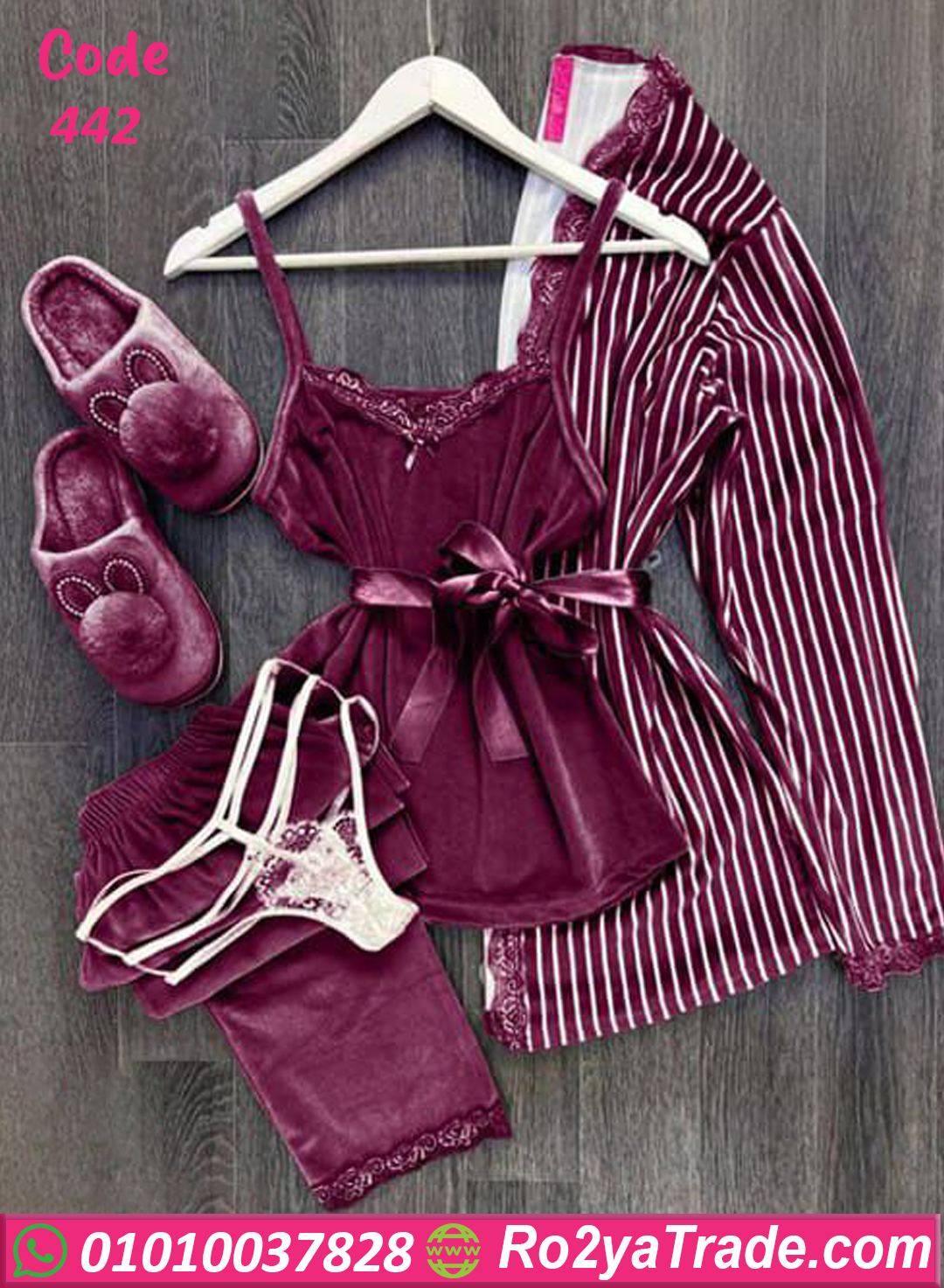 طقم قطيفة ناعم ودافي جدًا، جاكت طويل ستريب بشياكة مميزة ومعاه توب قطيفة بحزام يحدد الشكل، وبانتي وشورت بنفس الستايل.