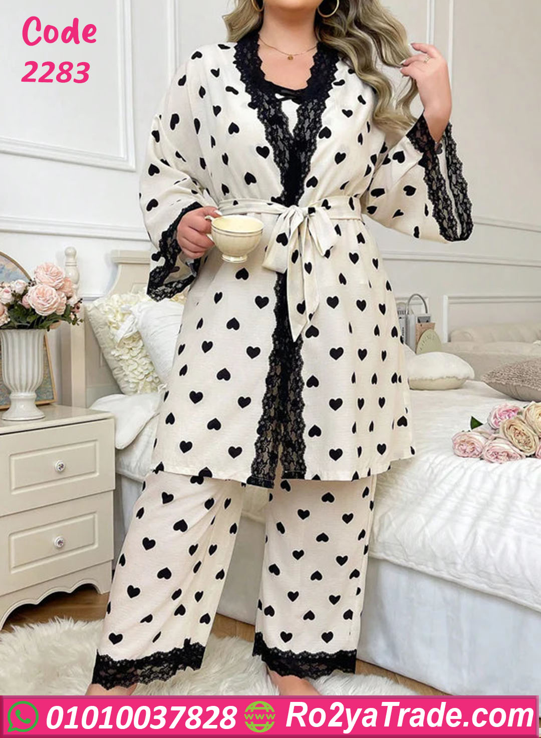 الطقم بيتكون من 3 قطع: توب، بنطلون، وروب بنفس النقشة، ومناسب للبنات والسيدات اللي بيحبوا الستايل الهادي الأنيق في البيت.