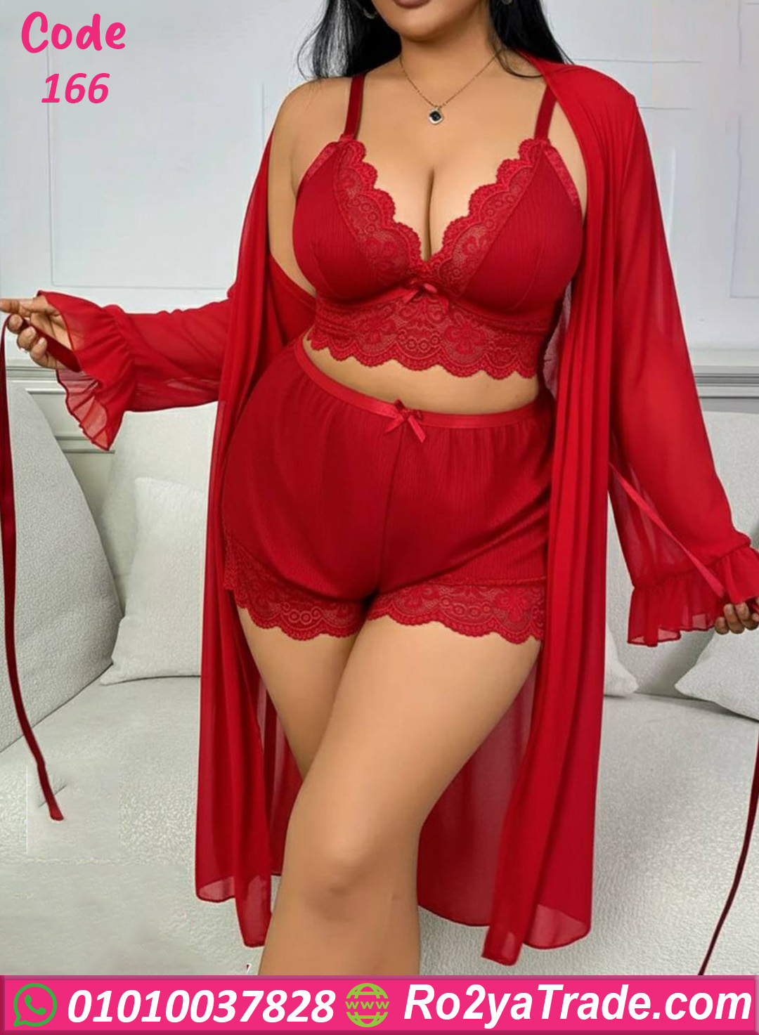 طقم لانجري كود 166 من ماركة Sexy & Curvy يجمع بين الجرأة والرقي في تصميم متكامل. يتكون من توب دانتيل مزين بتفاصيل أنثوية ناعمة، شورت مريح بخصر مطاطي، وروب شيفون شفاف بأكمام واسعة يمنحك لمسة فخامة إضافية.
