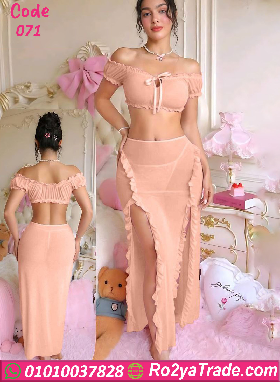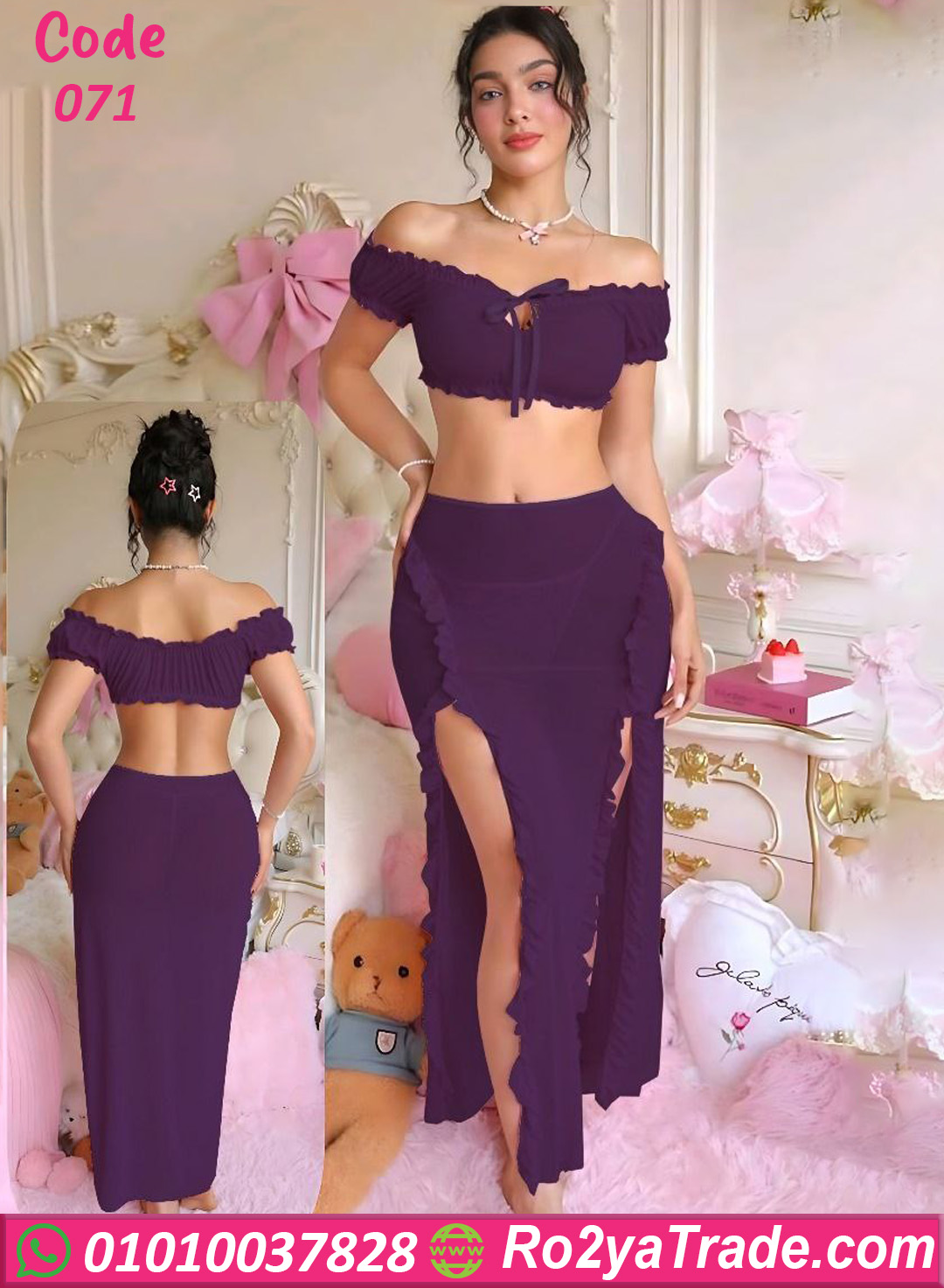 طقم ميني جيب كود 071 يتميز بتصميم عصري يجمع بين البساطة والجاذبية، حيث تأتي البلوزة بتصميم أوف شولدر مع كشكشة أنيقة تضيف لمسة أنثوية جذابة وتبرز جمال الكتفين.