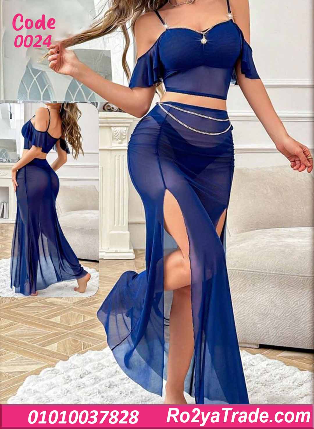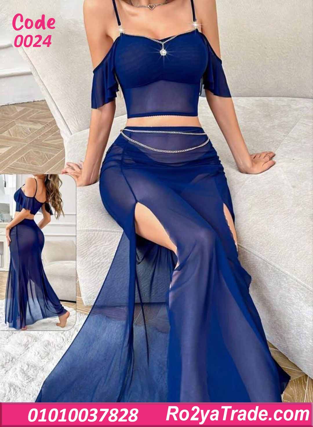 طويلة شفافة بقصة انسيابية. يتميز بفتحة جانبية جريئة تبرز جمال القوام مع