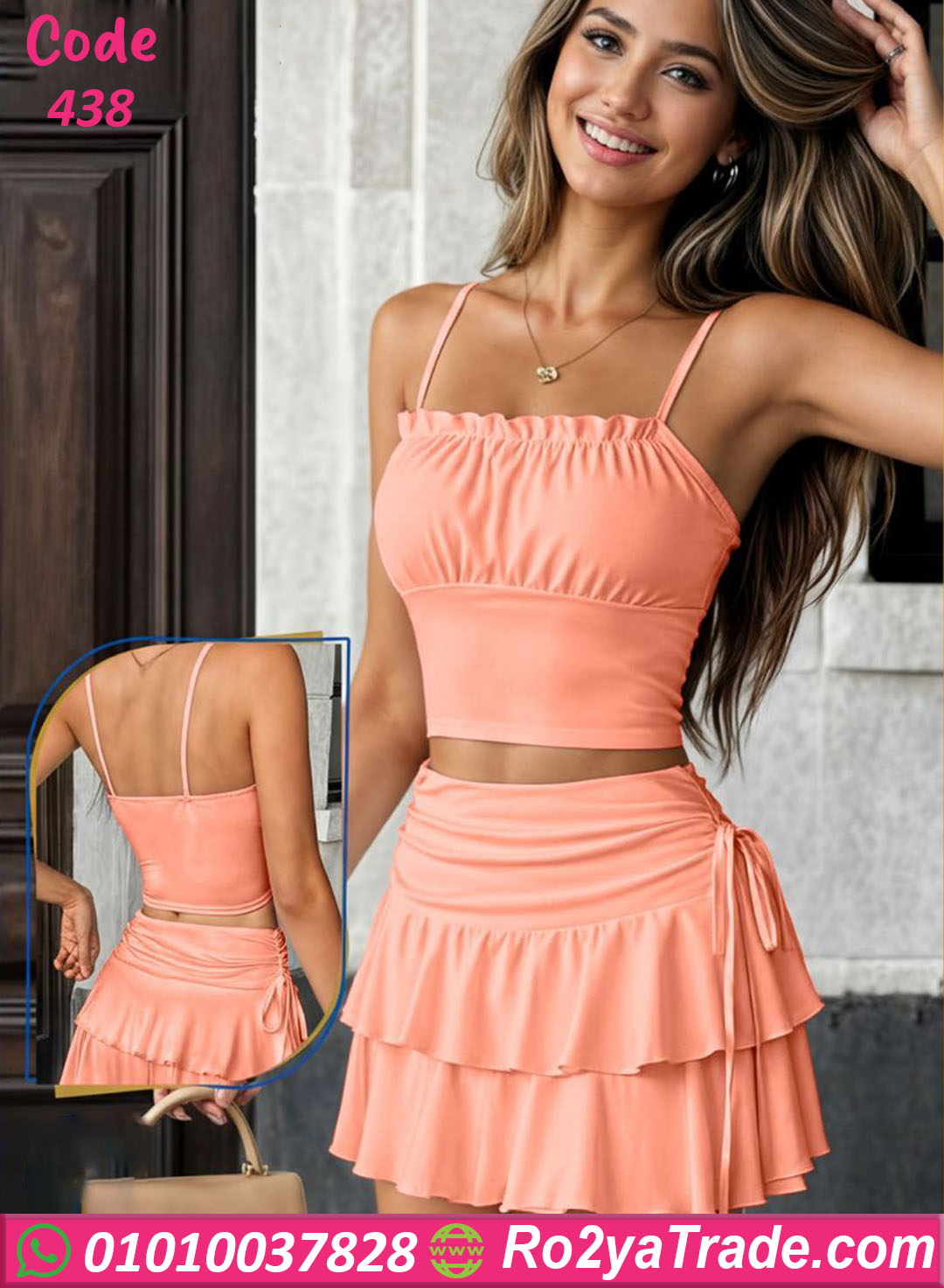الطقم مكون من قطعتين: توب قصير بحمالات رفيعة يمنح شكل أنيق وجذاب،