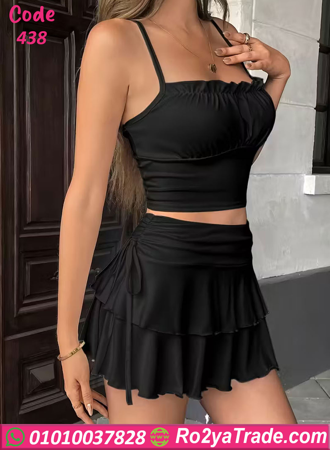 طقم حريمي أنيق مكون من توب قصير مع ميني جيب بطبقات ناعمة تمنحك إطلالة أنثوية جذابة وعصرية مناسبة للبيت والخروجات الخفيفة.