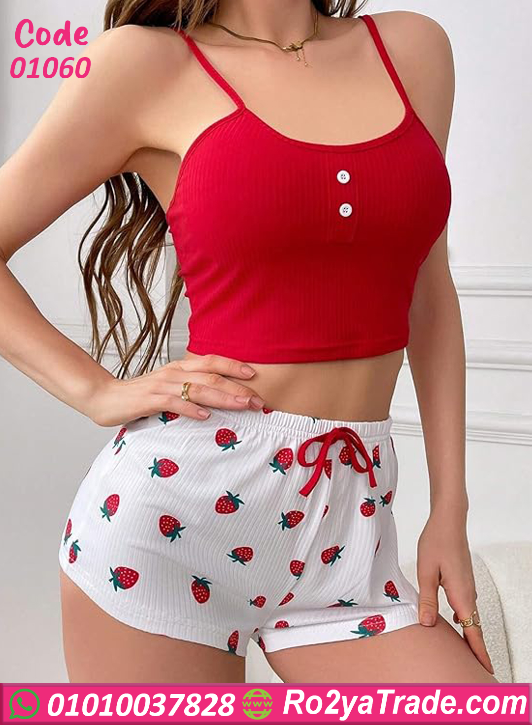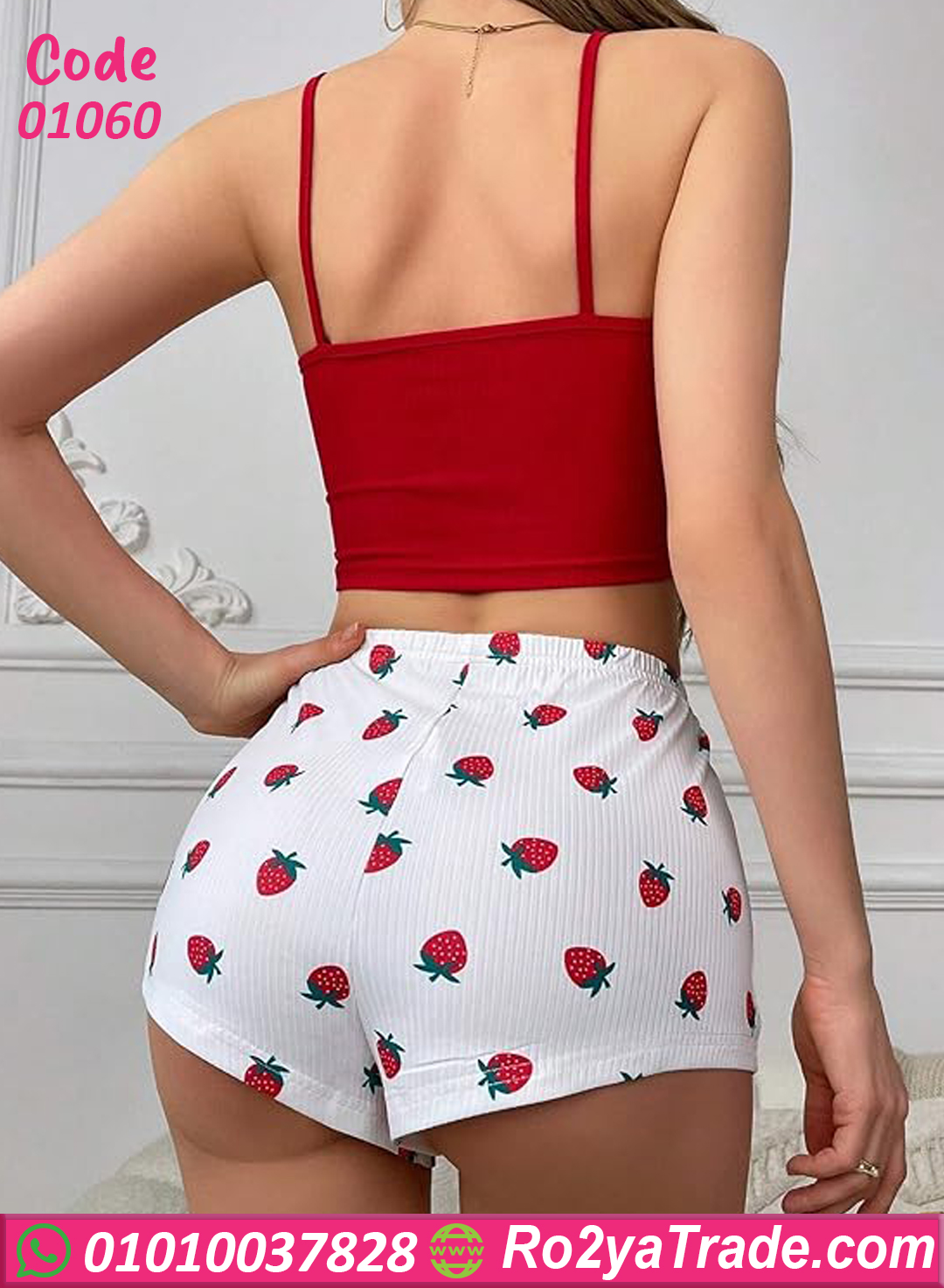 الشورت بقى واسع ومريح بخامة قطن نوعًا ما “ريب” بتهوي الجسم ومناسبة للجو الحر، وكمان مطبوع فراولة شكلها كيوت وجذاب جدًا 🤩