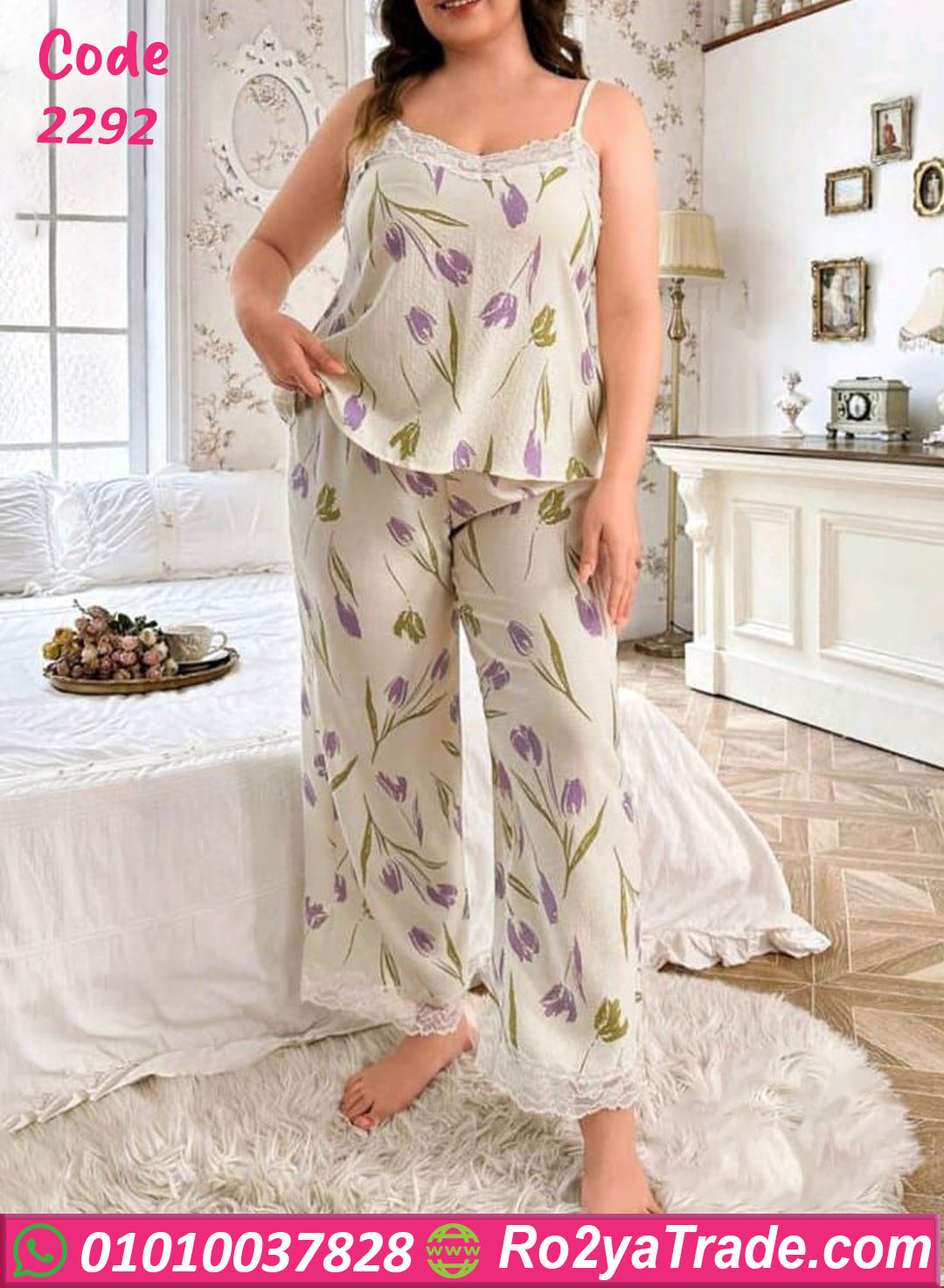 النقشة الوردية البنفسجية على أرضية بيچ بتدي إحساس بالهدوء والرقي، ومع لمسة الدانتيل الأبيض على الأطراف الطقم بقى فخم وأنثوي جدًا.