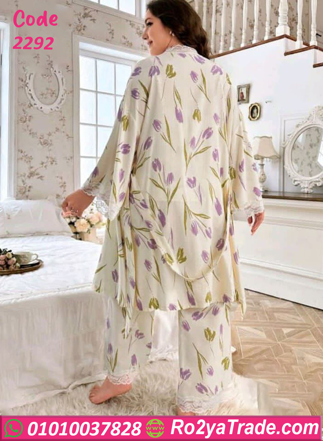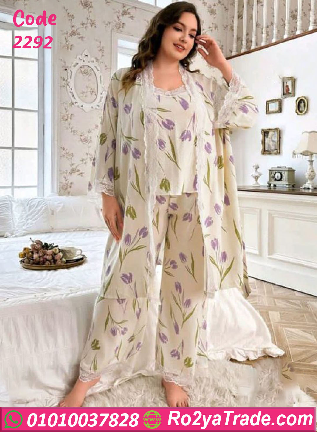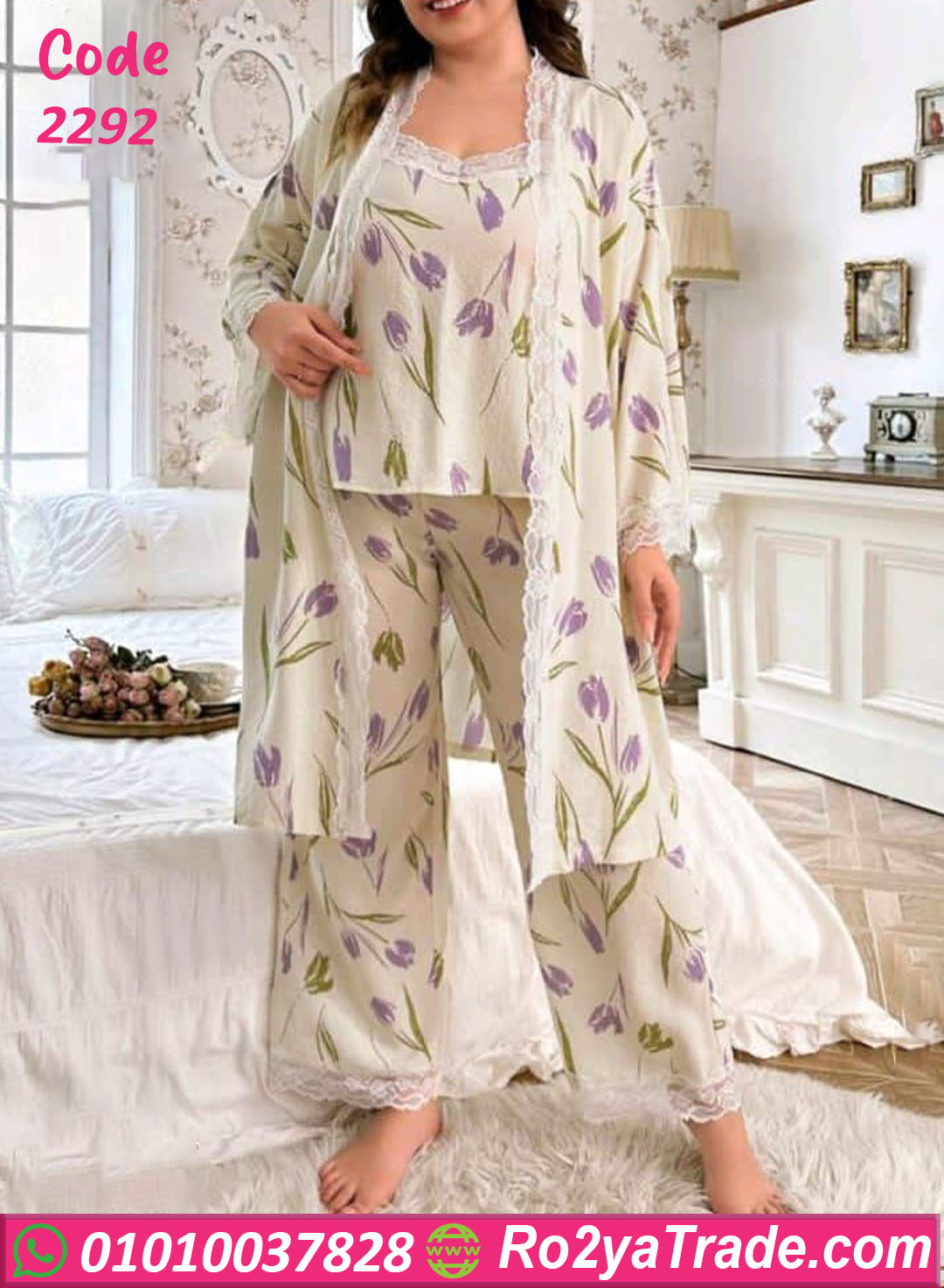 الطقم بيتكوّن من 3 قطع (توب، بنطلون، روب بنفس النقشة) بخياطة متقنة وستايل واسع مريح، مناسب لكل مقاسات البيج سايز.