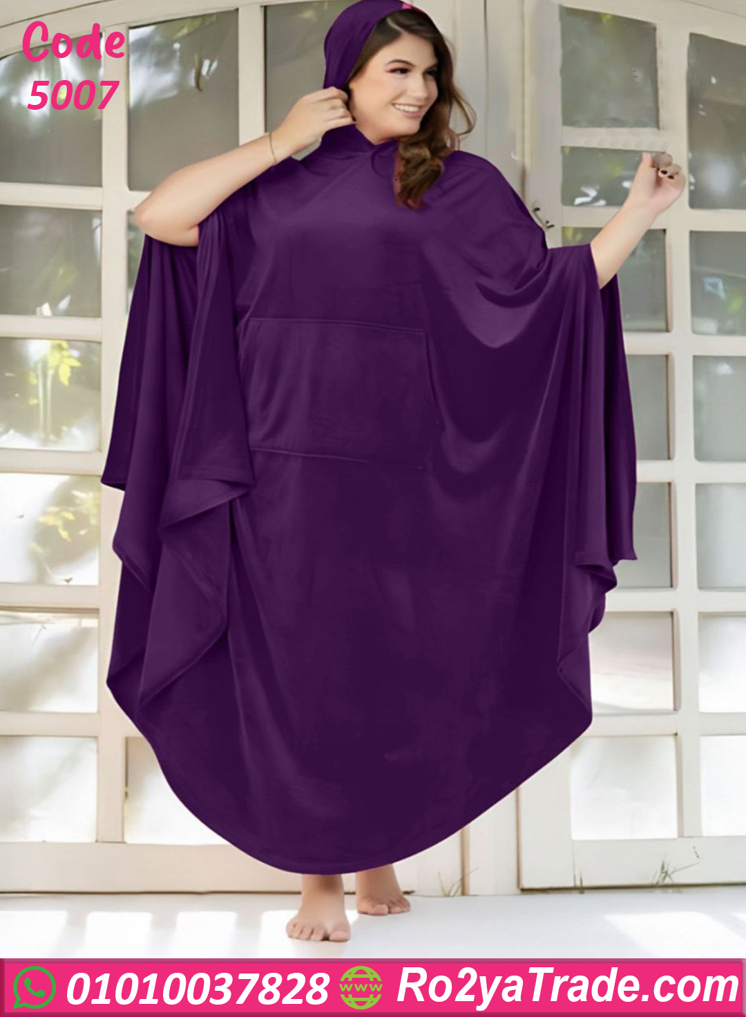 عباية بكاب واسع من خامة القطيفة المضبوعة اللي بتجمع بين النعومة والفخامة، تصميمها انسيابي يدي شكل أنثوي شيك جدًا، وفي نفس الوقت مريح للحركة داخل البيت.