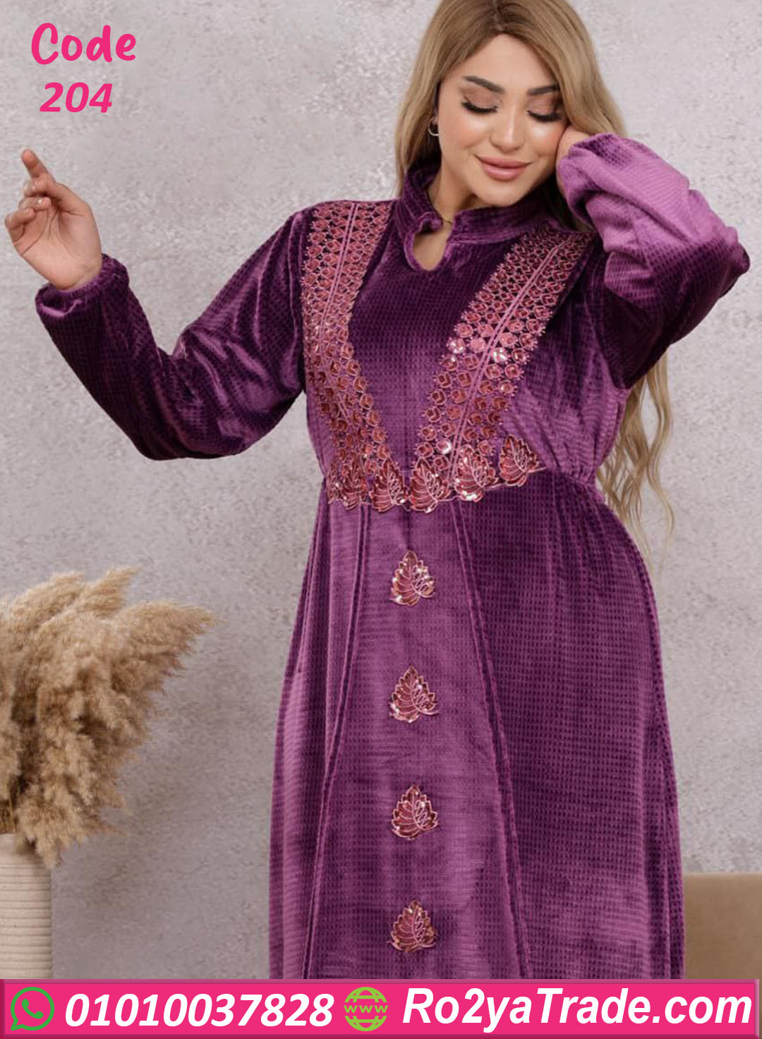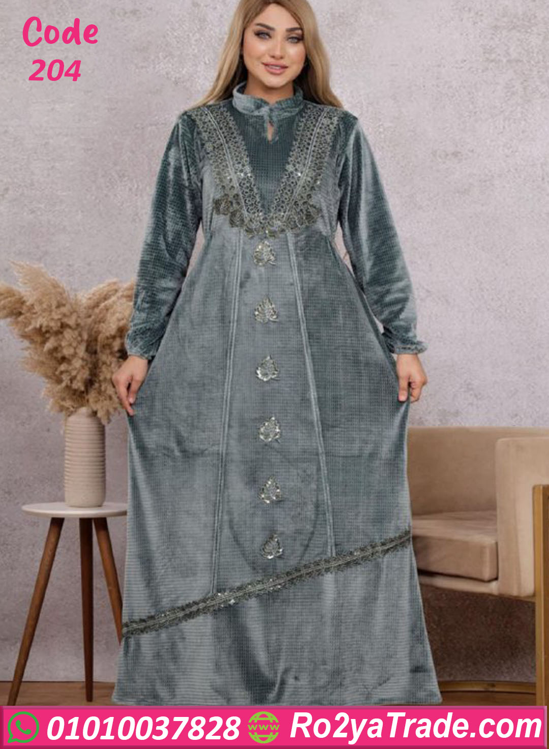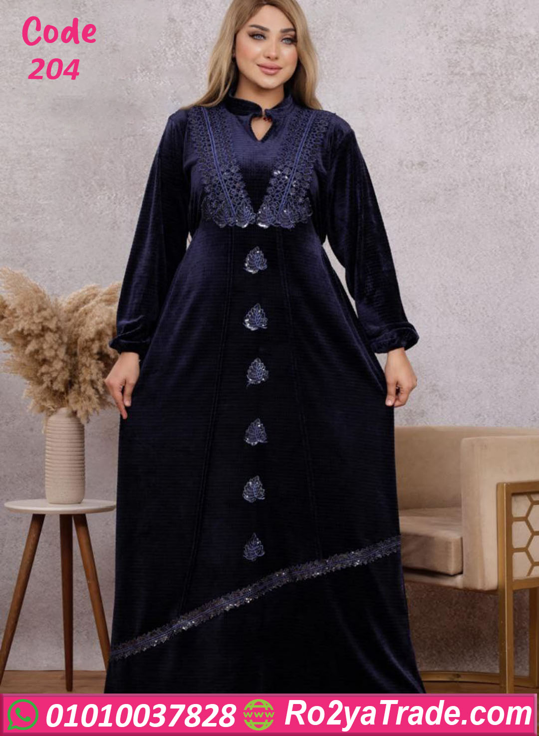 عباية بيتي شتوي من خامة القطيفة الفخمة بتصميم محتشم وأنيق، مزينة بتطريز فاخر في منطقة الصدر والأكمام مع لمسات لامعة جذابة.