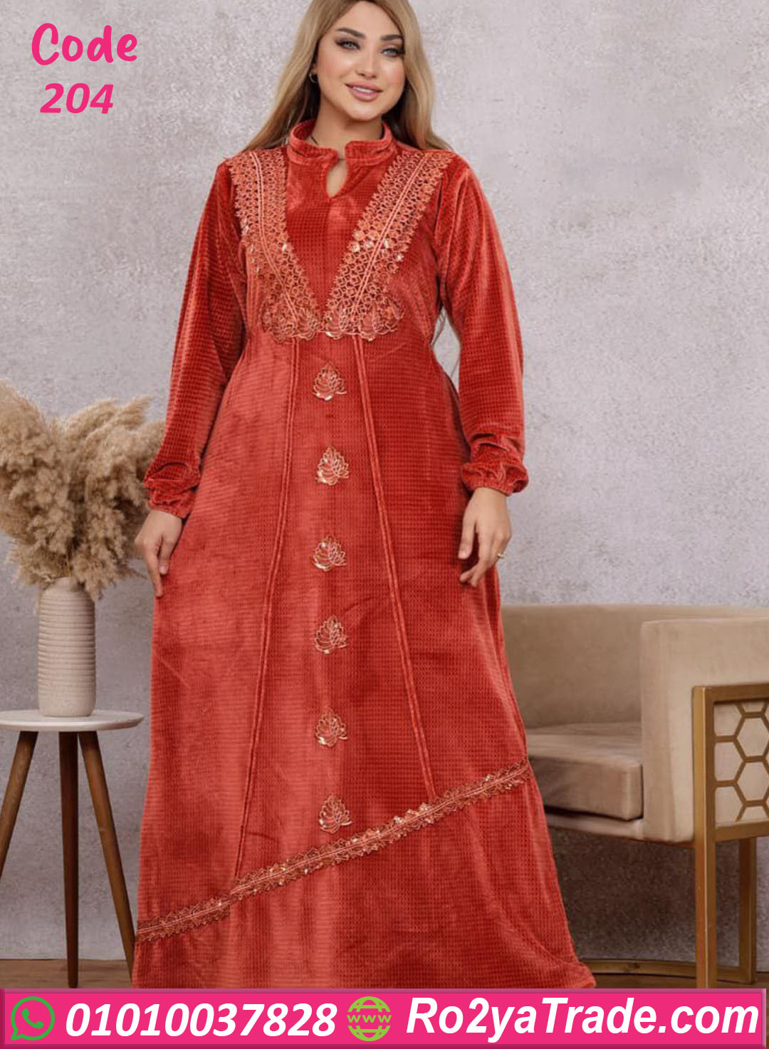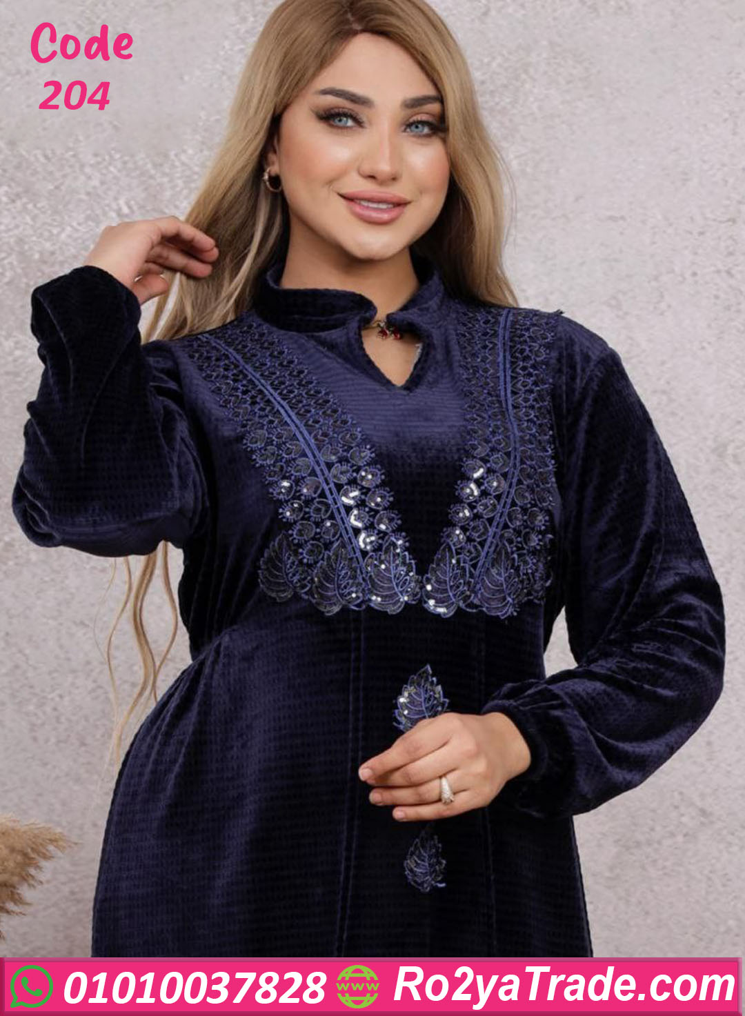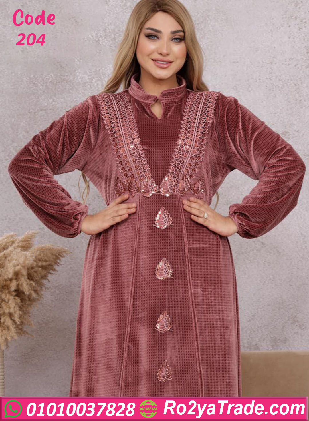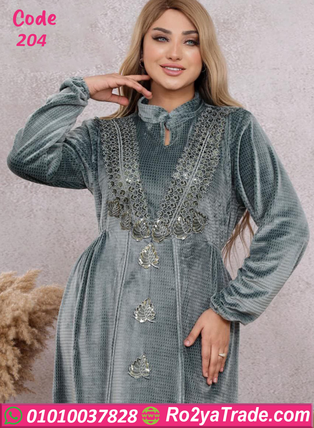 عباية بيتي شتوي من خامة القطيفة الفخمة بتصميم محتشم وأنيق، مزينة بتطريز فاخر في منطقة الصدر والأكمام مع لمسات لامعة جذابة.