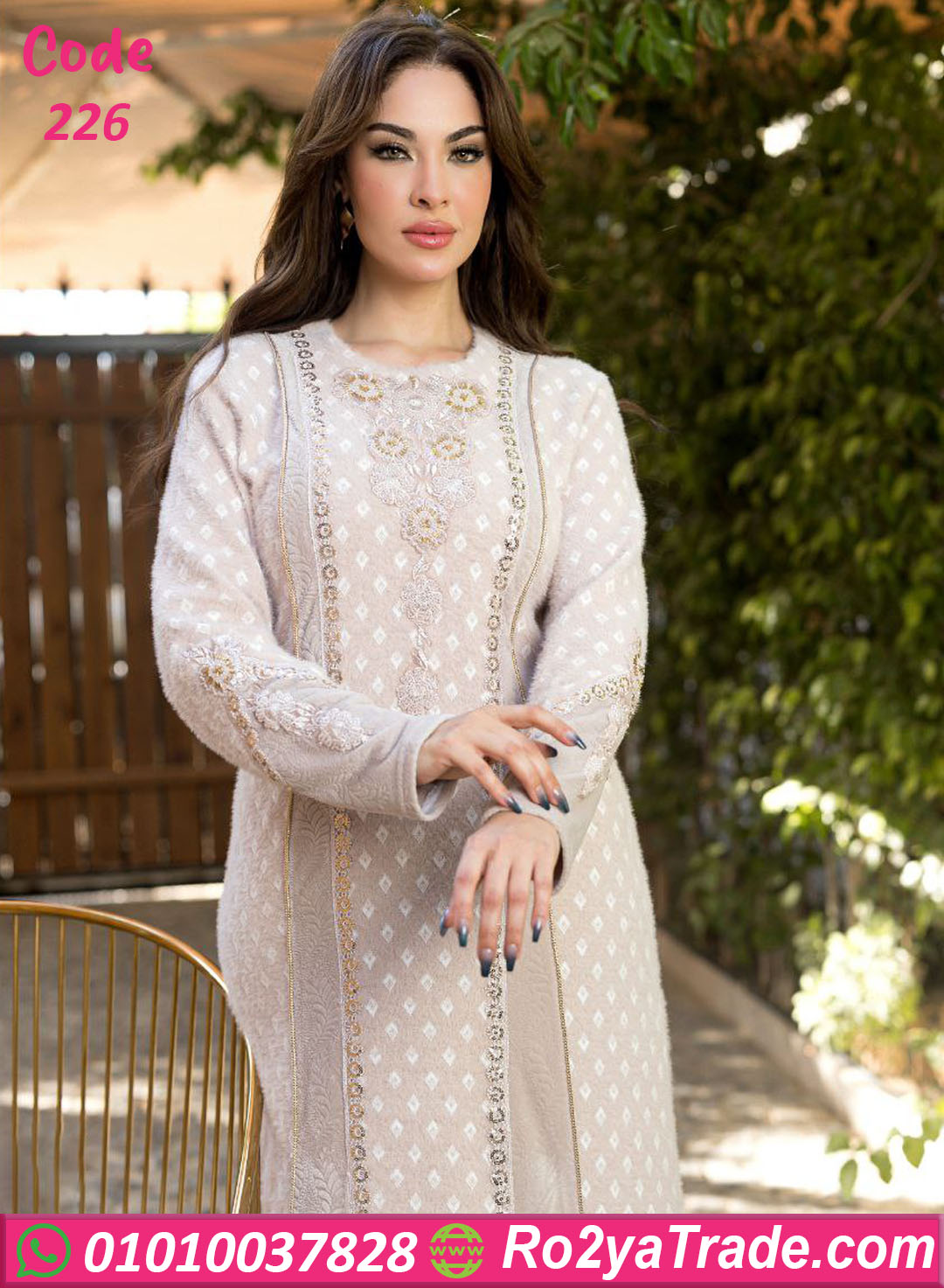 تصميمها بسيط وفي نفس الوقت فيه لمسة رُقيّ بالتطريز الدقيق اللي على الصدر والأكمام، بيدي شكل أنثوي ناعم جدًا 💕