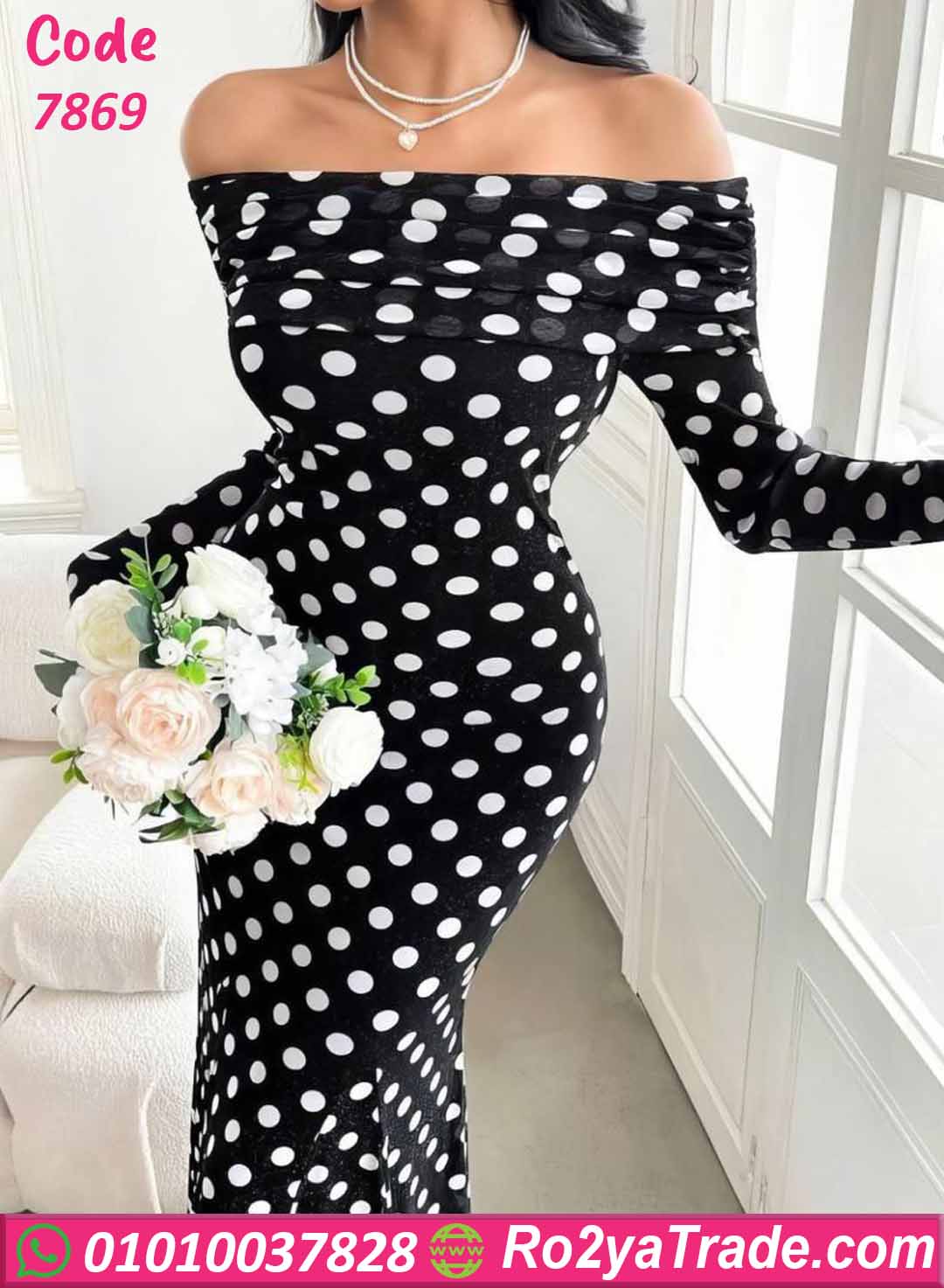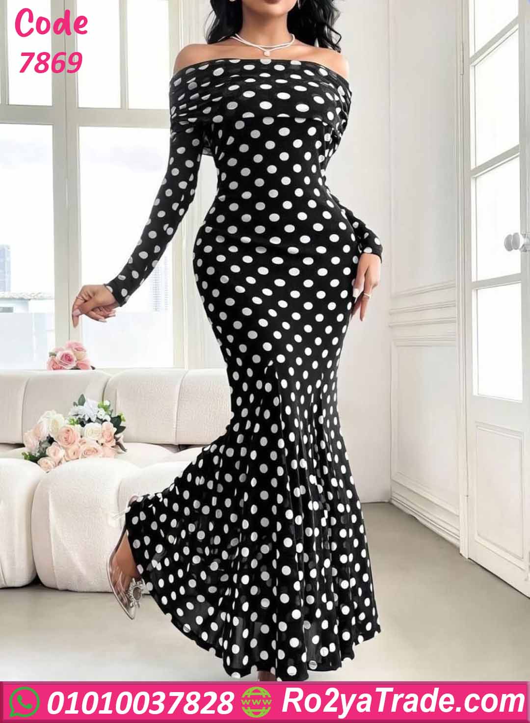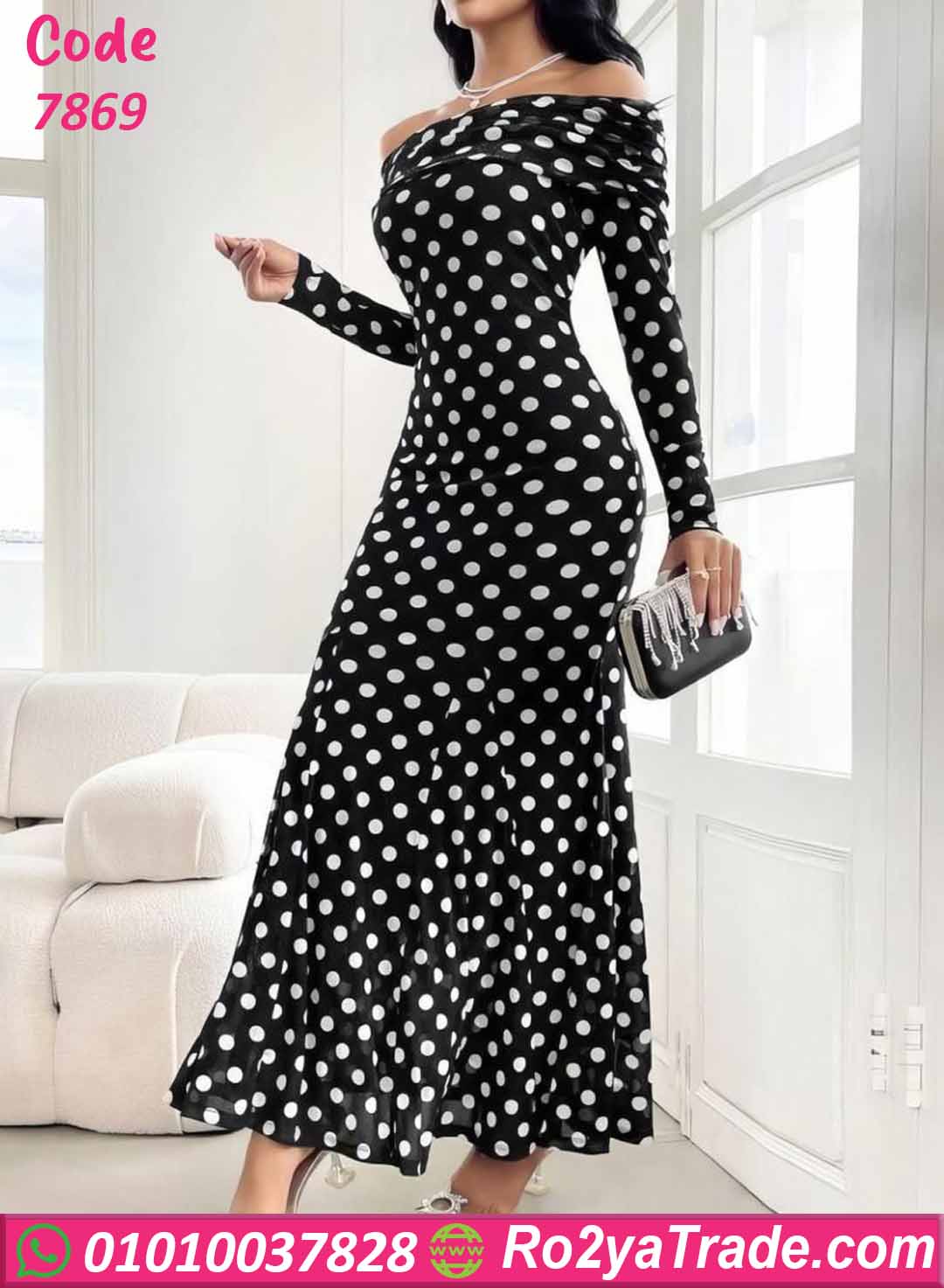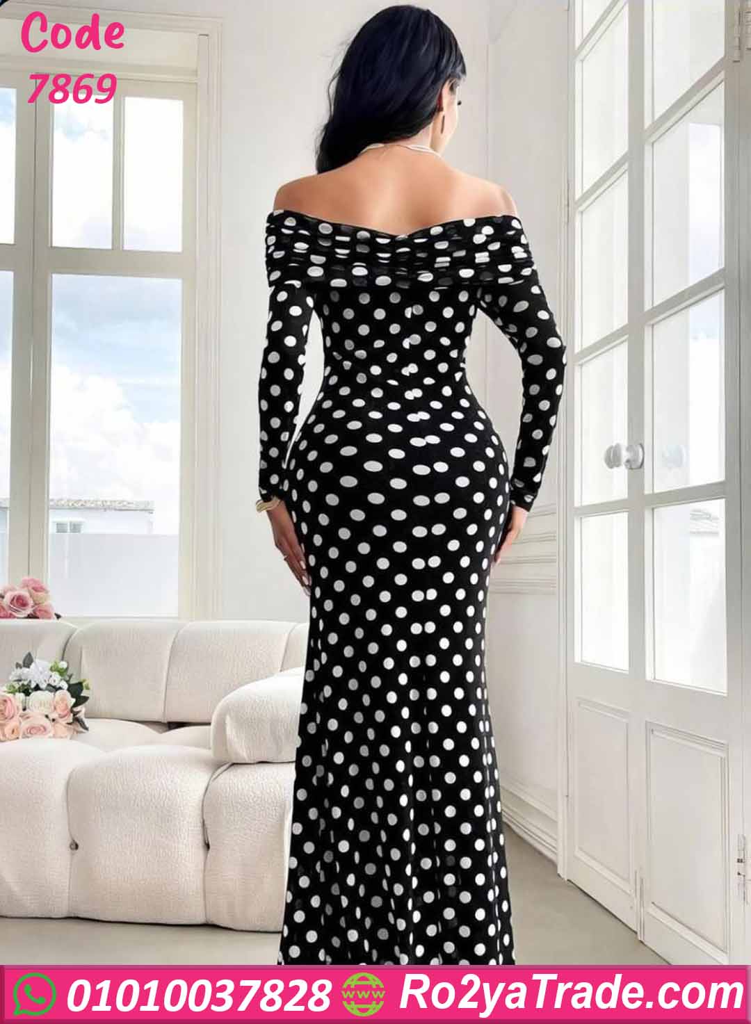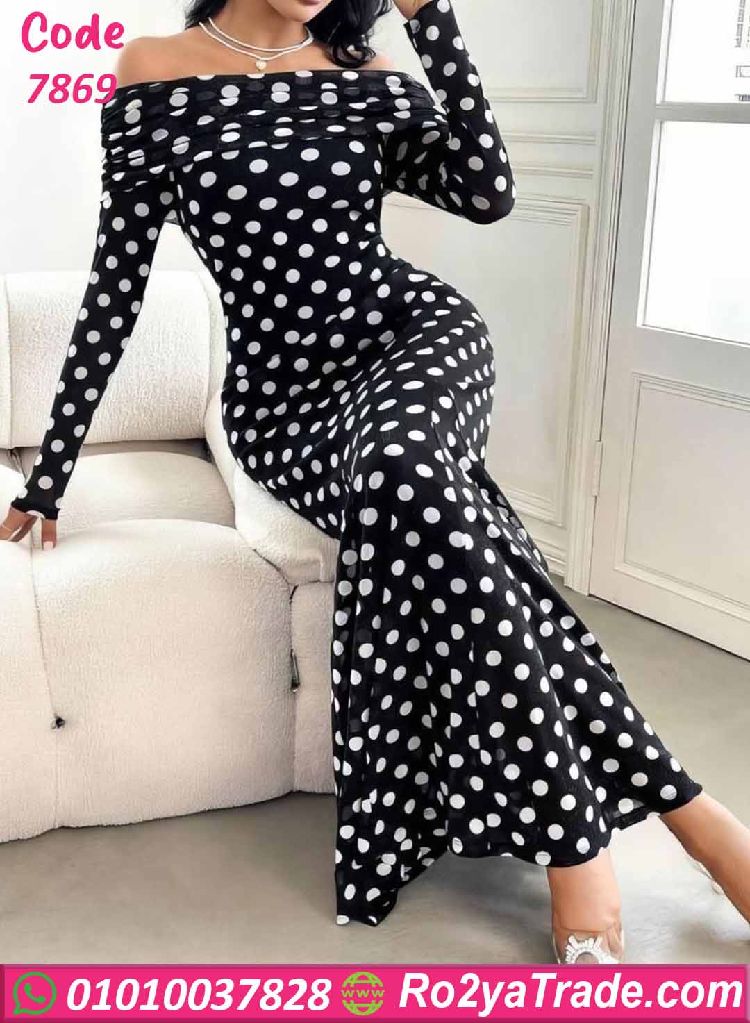 فستان بولكا طويل 7869 من Lavida اختيار مثالي لعشاق الإطلالة الكلاسيك الأنيقة بلمسة عصرية. يتميز بتصميم أوف شولدر يبرز الأكتاف بأنوثة جذابة، مع قصة مجسمة على الجسم تنسدل بانسيابية حتى الأسفل لتعطي شكل أنيق ومتناسق.