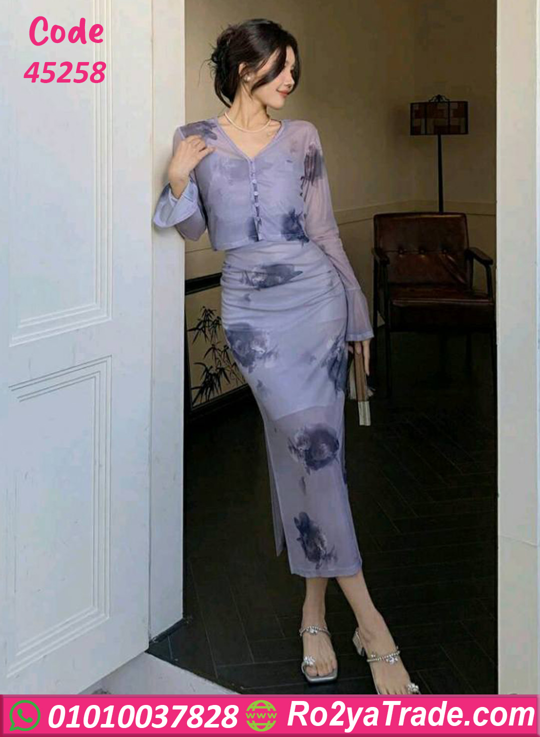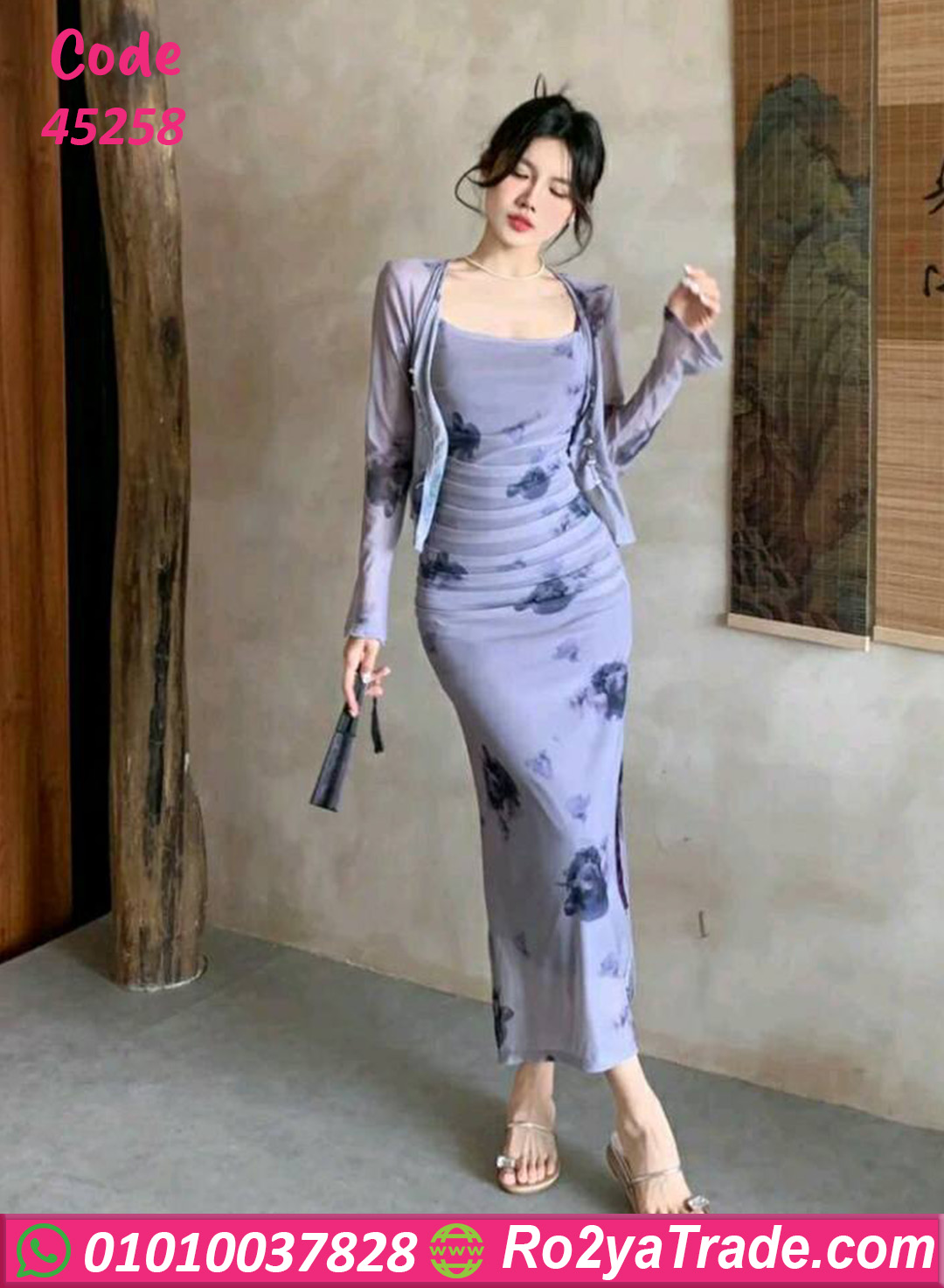 فستان صيفي طويل بتصميم أنيق وطبعة ورد هادئة مع جاكيت خفيف لإطلالة راقية وعصرية.