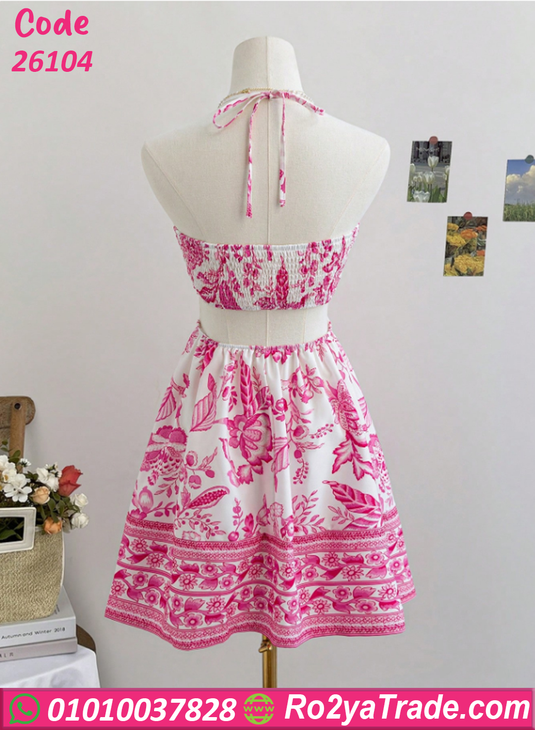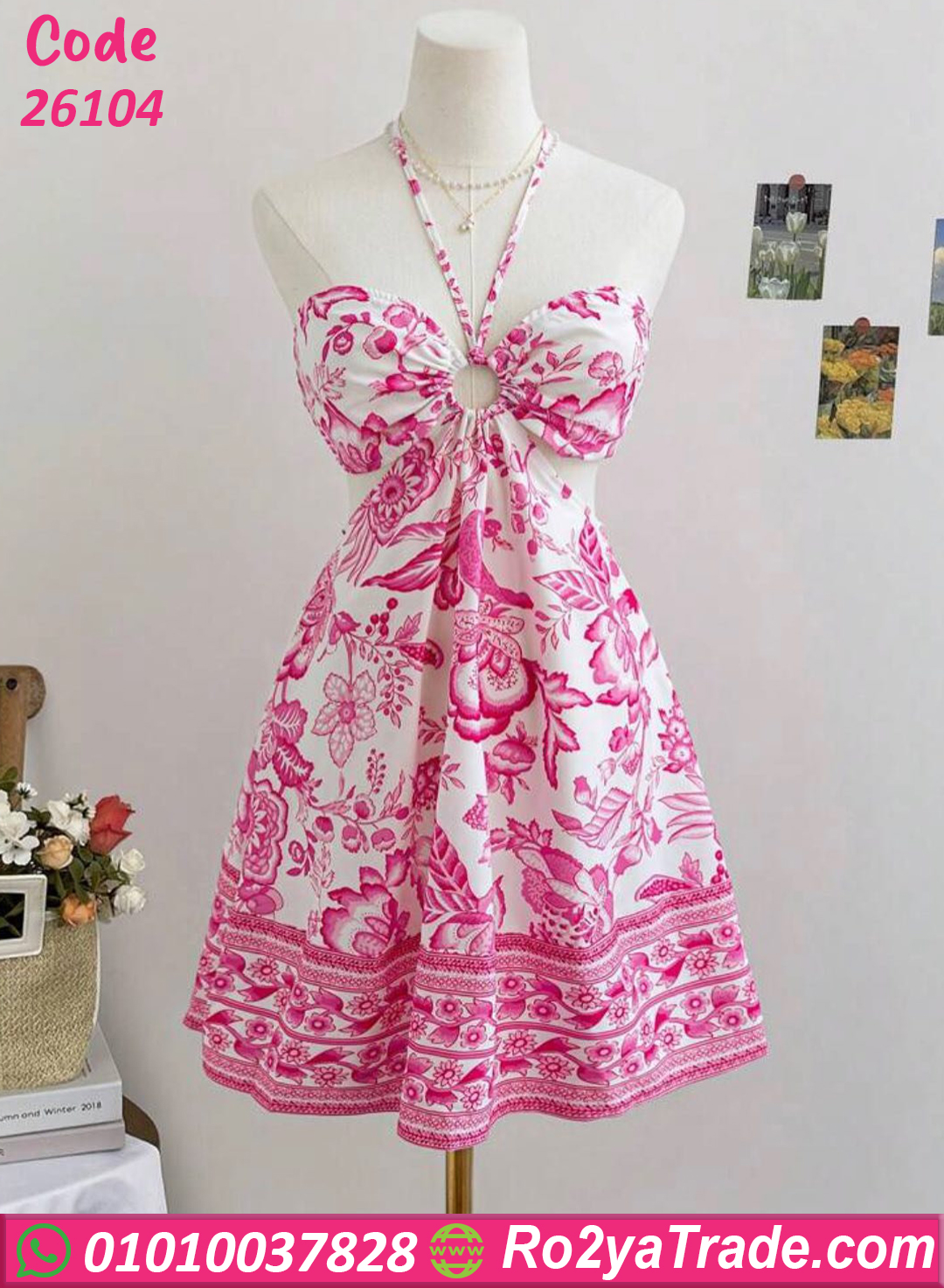 فستان صيفي قصير حريمي بنقشة ورد أنيقة – كود 26104