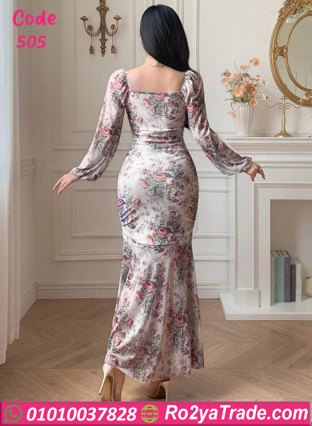 الورود المرسومة على الفستان بتدي شكل راقي يناسب المناسبات النهارية أو السهرات الهادية.