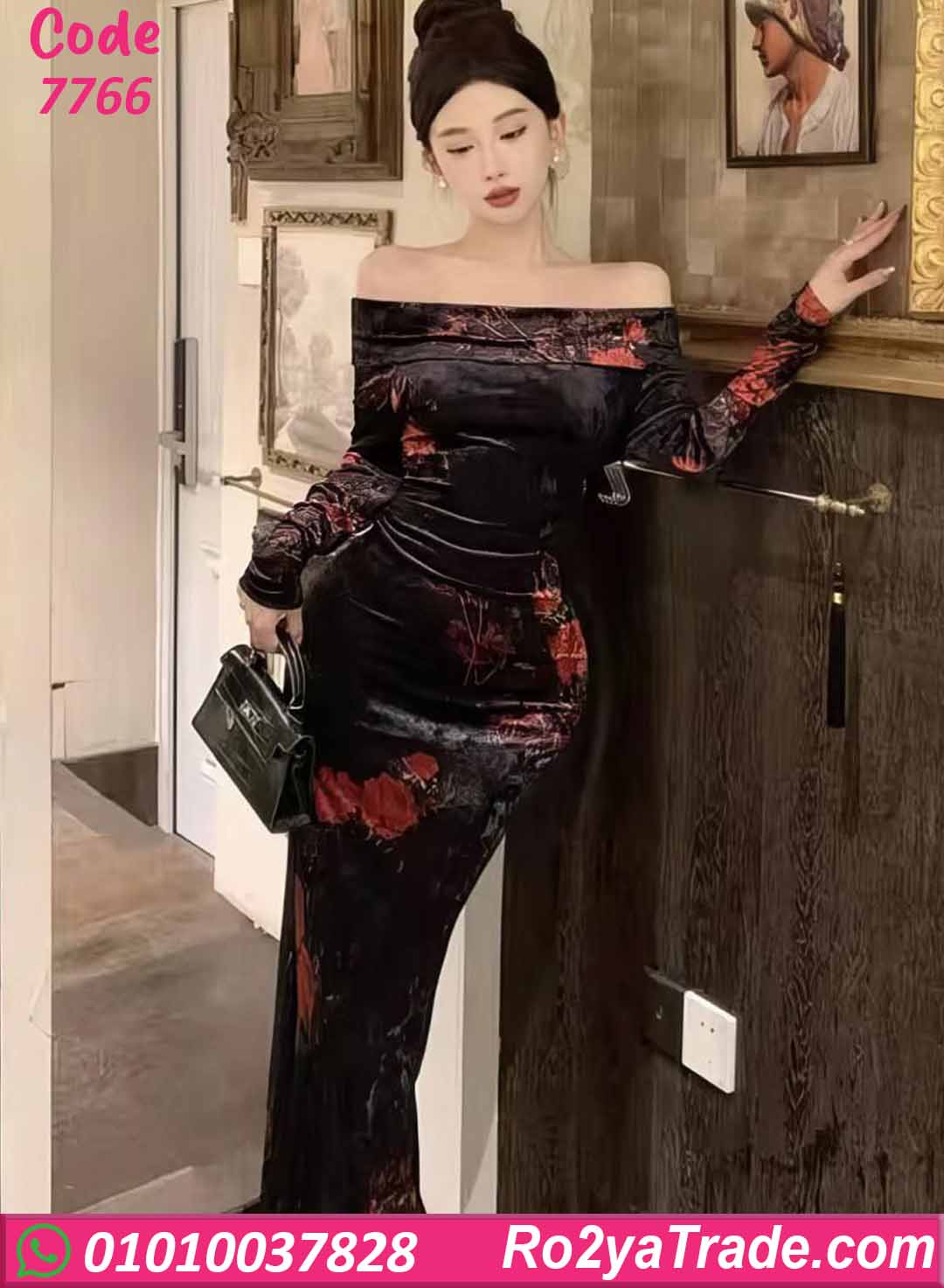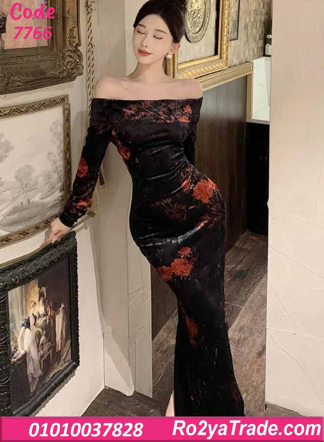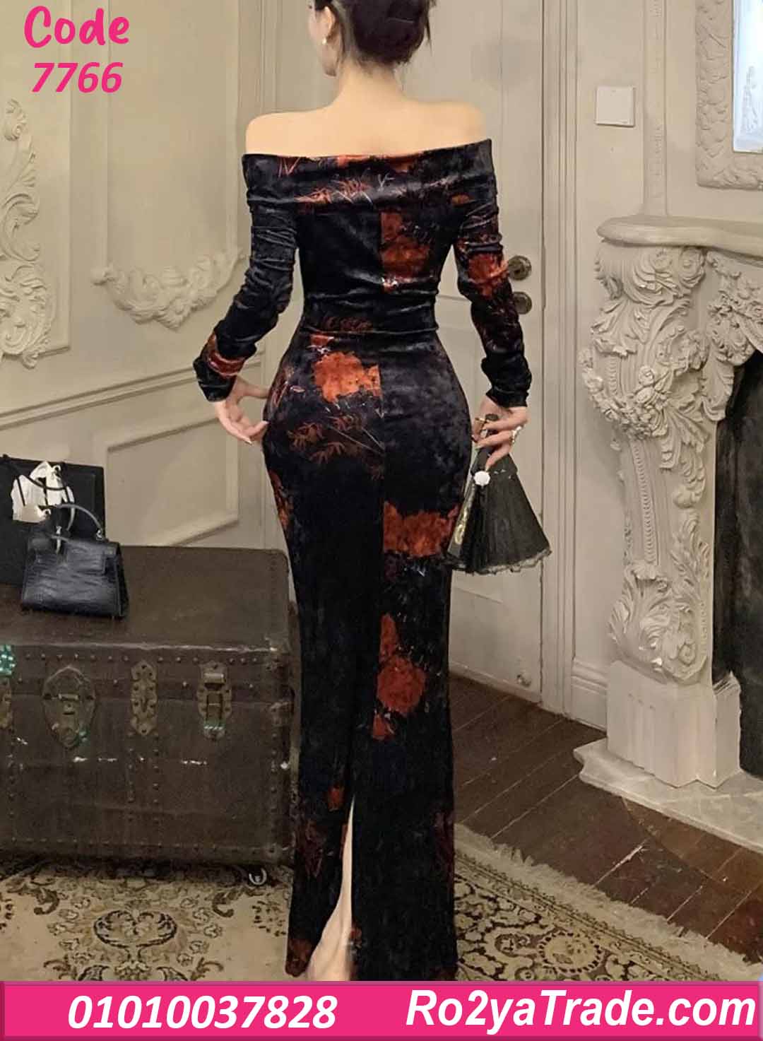 فستان شتوي طويل بخامة قطيفة ناعمة بلمعة فخمة ونقشة ورد مميزة على أرضية سوداء أنيقة. تصميم أوف شولدر بأكمام طويلة وقصة ضيقة تنتهي بذيل ميرميد يبرز جمال القوام بأنوثة طاغية. مناسب للسهرات والمناسبات الشتوية بإطلالة شيك وجريئة في نفس الوقت.