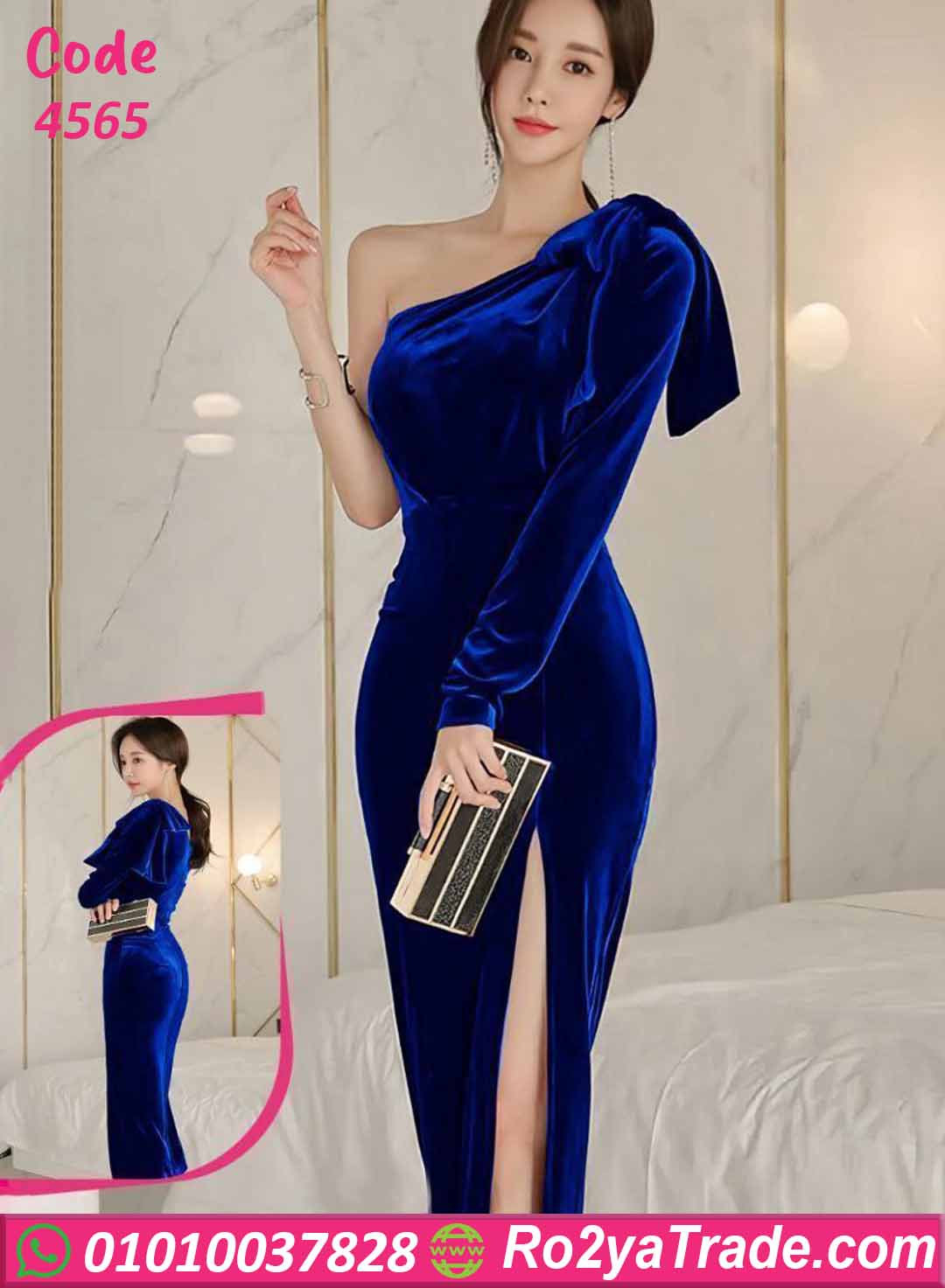 فستان شتوي طويل قطيفة بتصميم كتف واحد أنثوي وفتحة جانبية جذابة يبرز القوام بإطلالة فخمة وراقية.