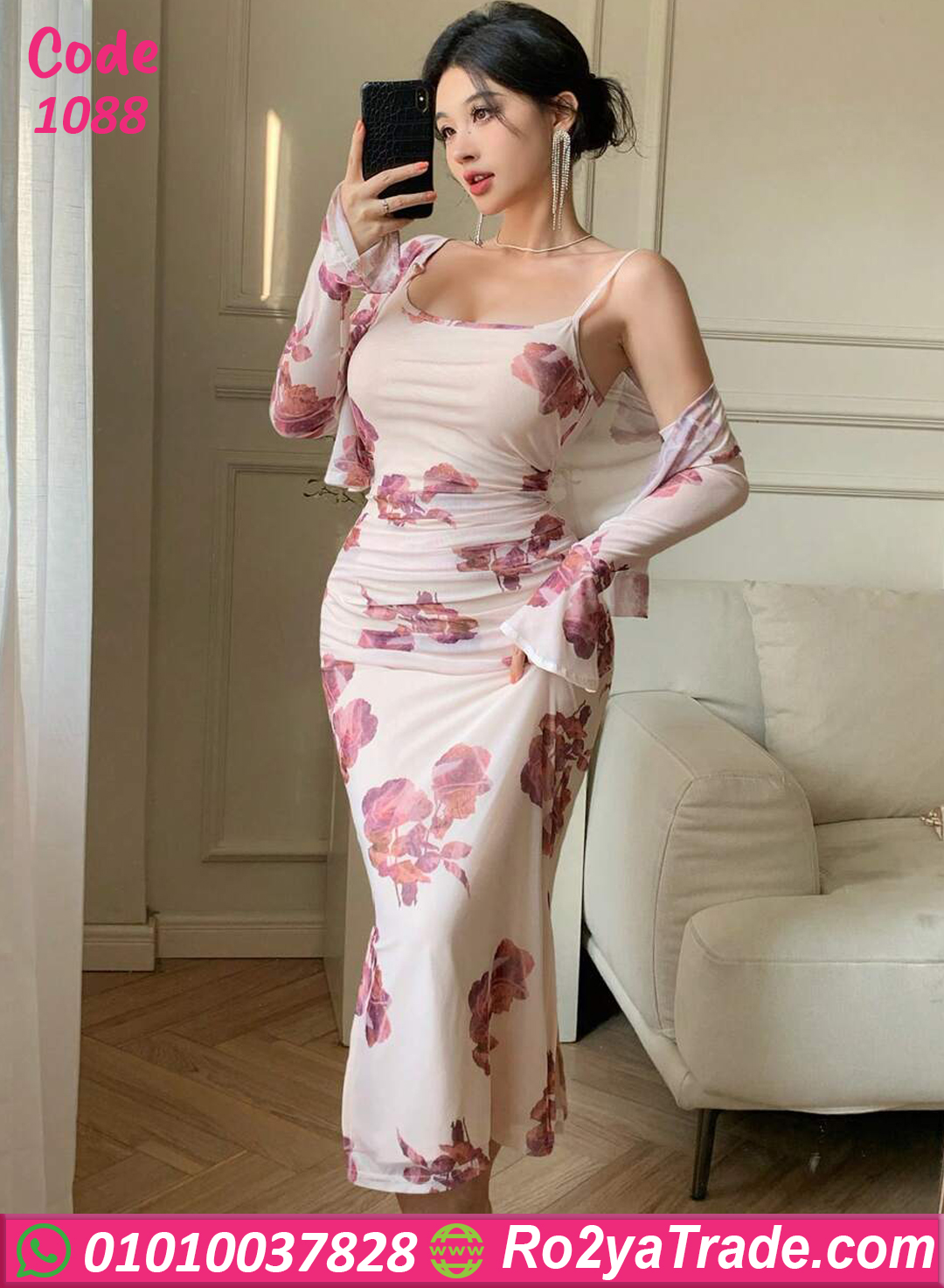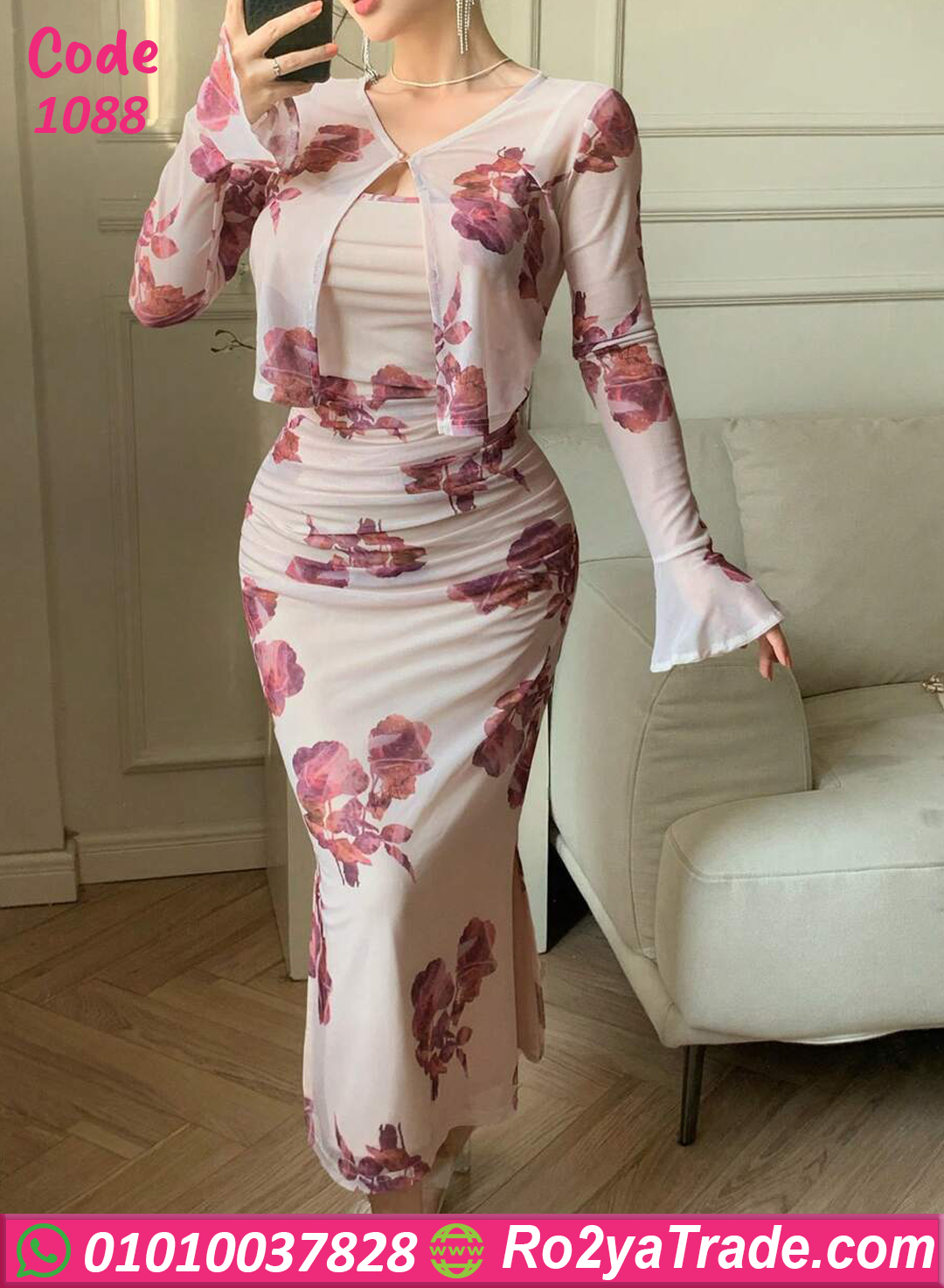 الخامة زبدة مستوردة ناعمة جدًا على الجسم ومريحة جدًا في اللبس، والتصميم عبارة عن فستان طويل لاصق بخطوط انسيابية بيبرز القوام، ومعاه جاكيت بنفس النقشة بيدي لمسة ناعمة ورقيقة 💕