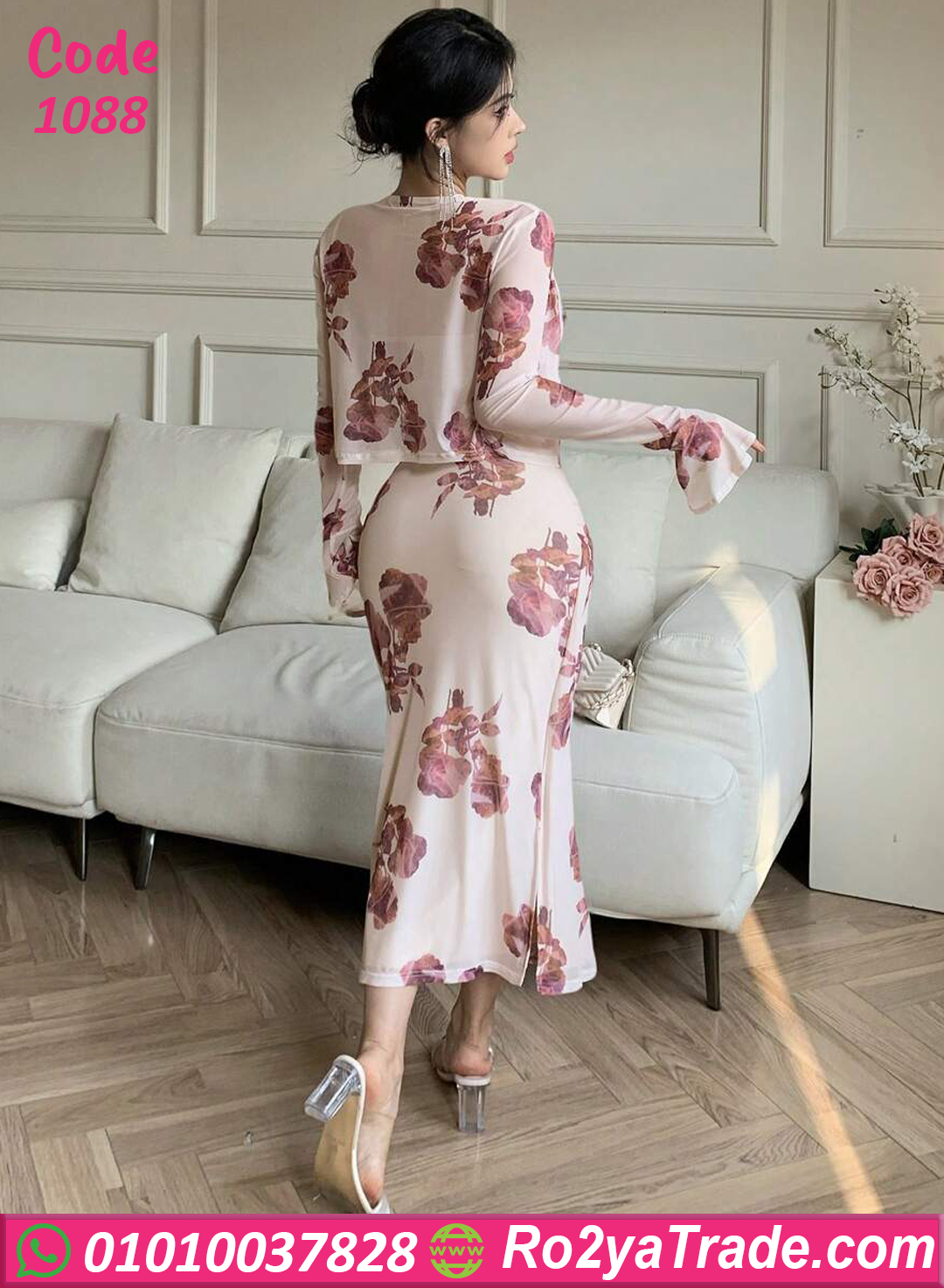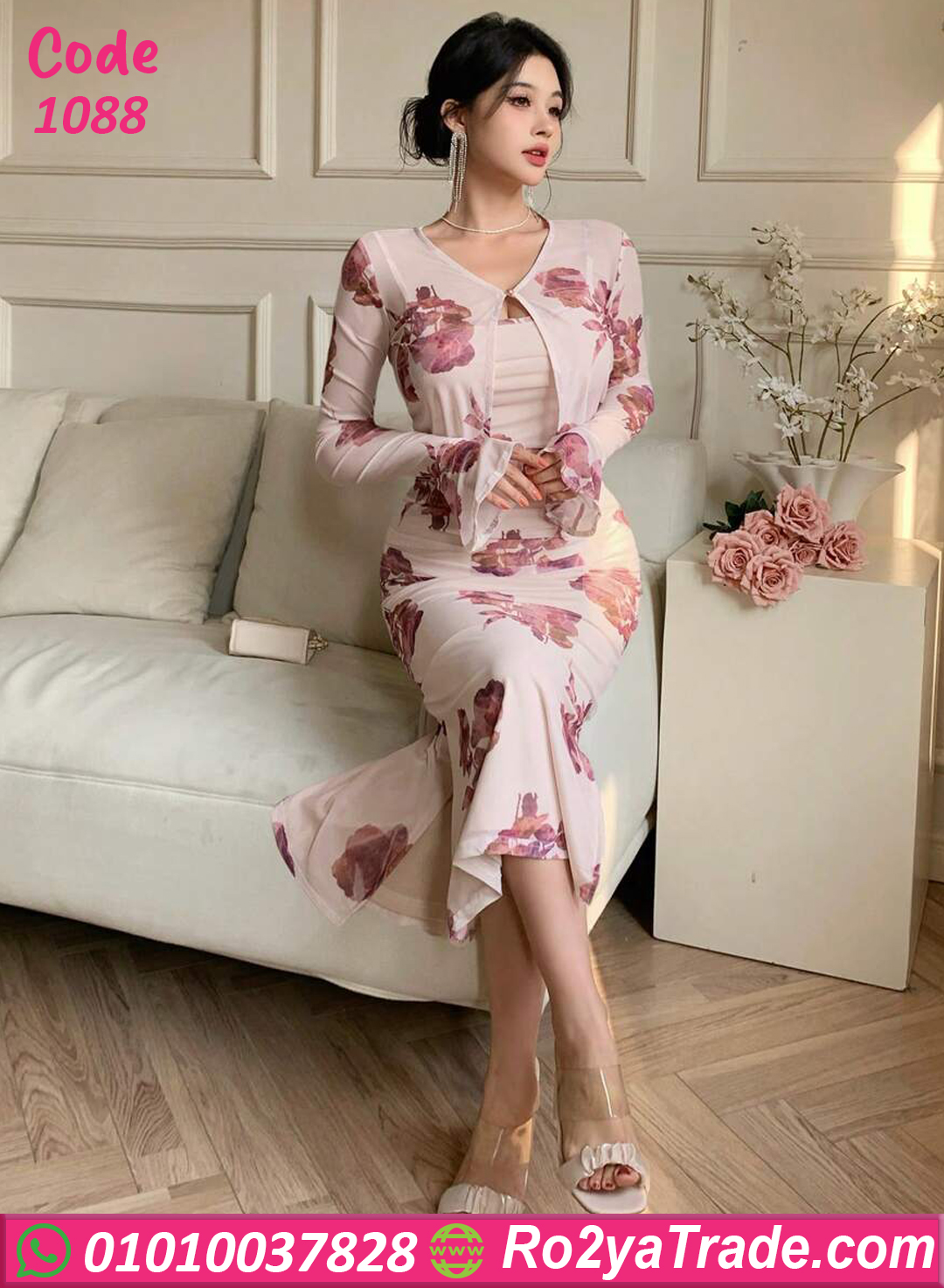 فستان كاش مايوه زبدة مستوردة بستايل وردي – كود 1088