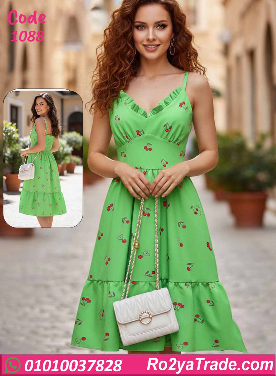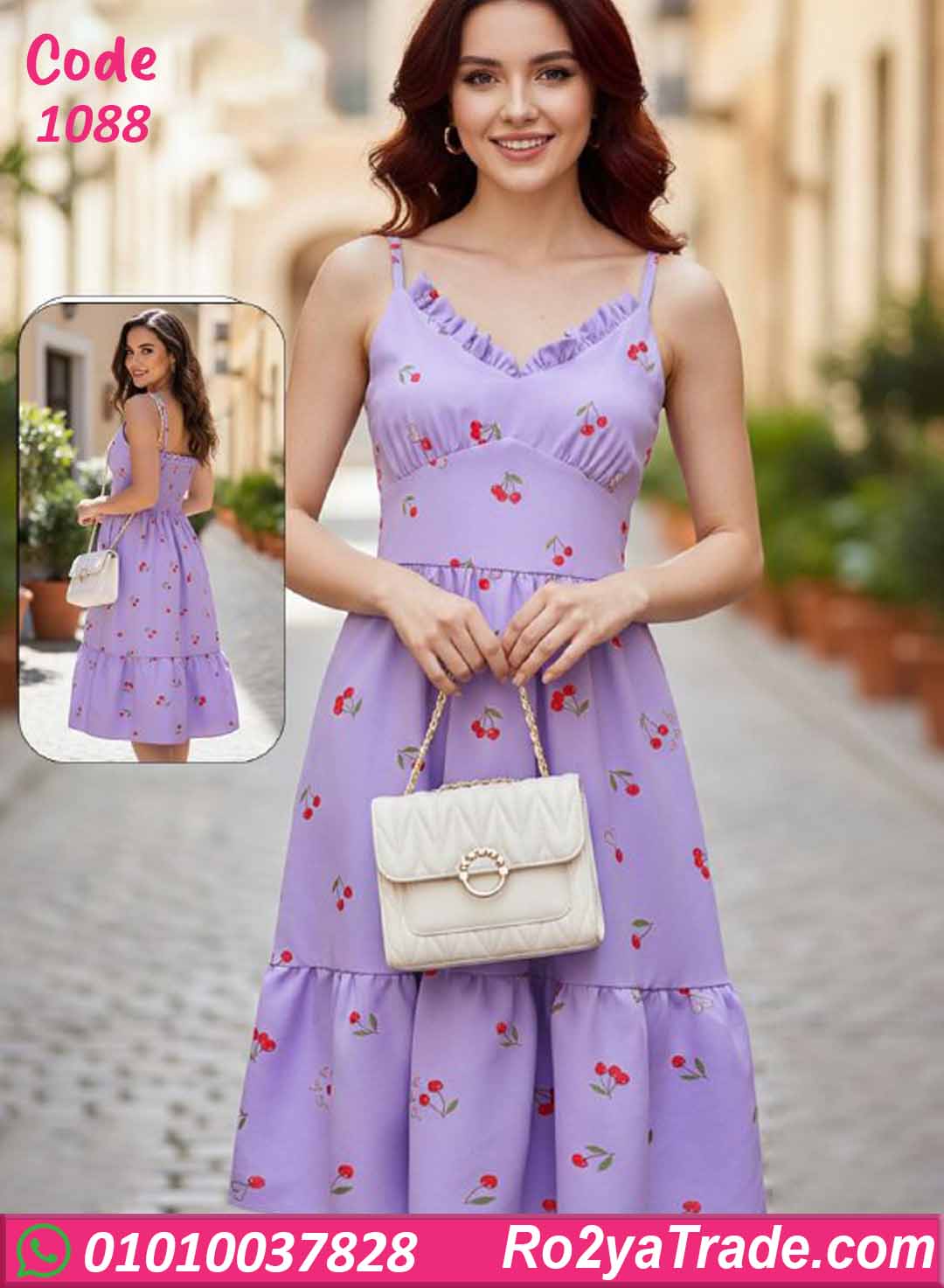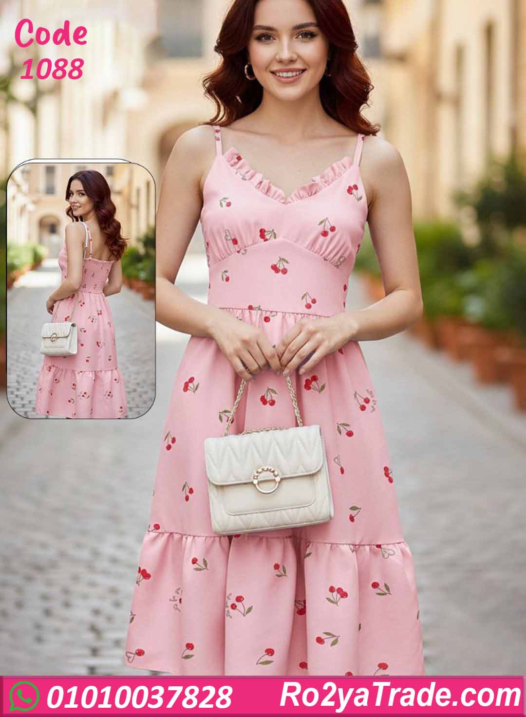فستان بيتي صيفي برسمة كريز (كرز) شيك، خامته خفيفة ومريحة ويدي شكل أنثوي ناعم.