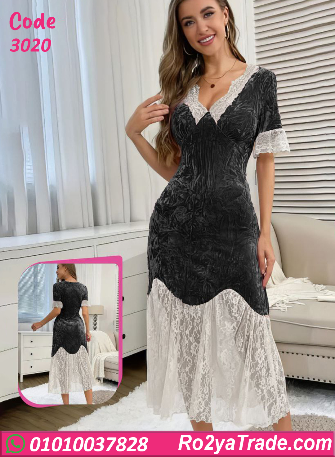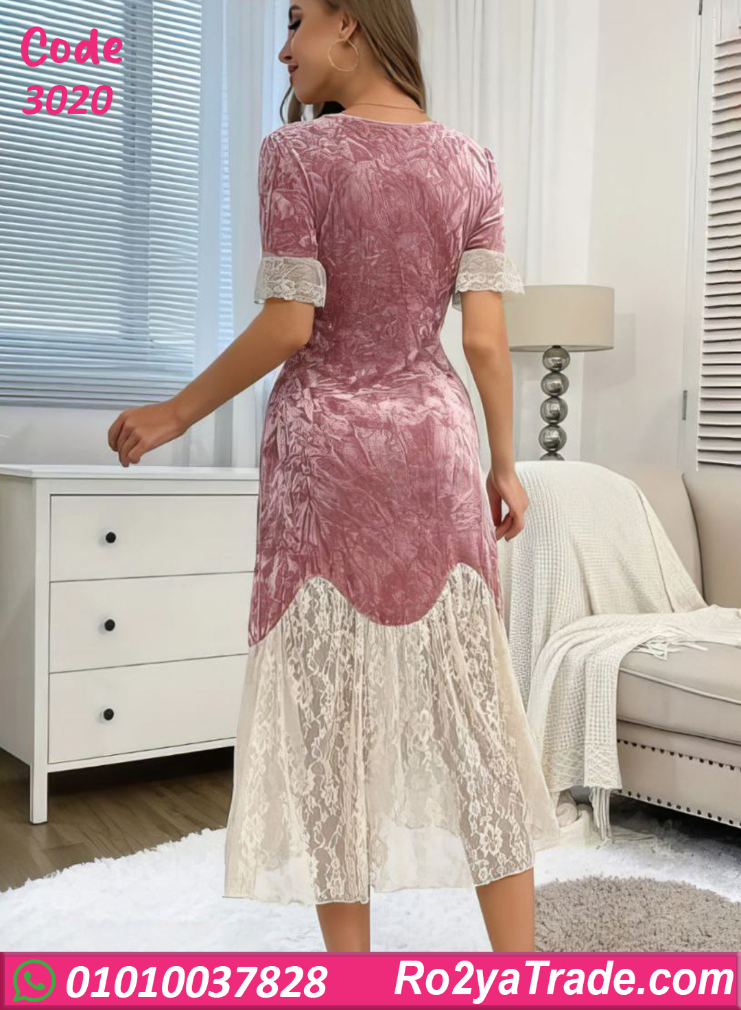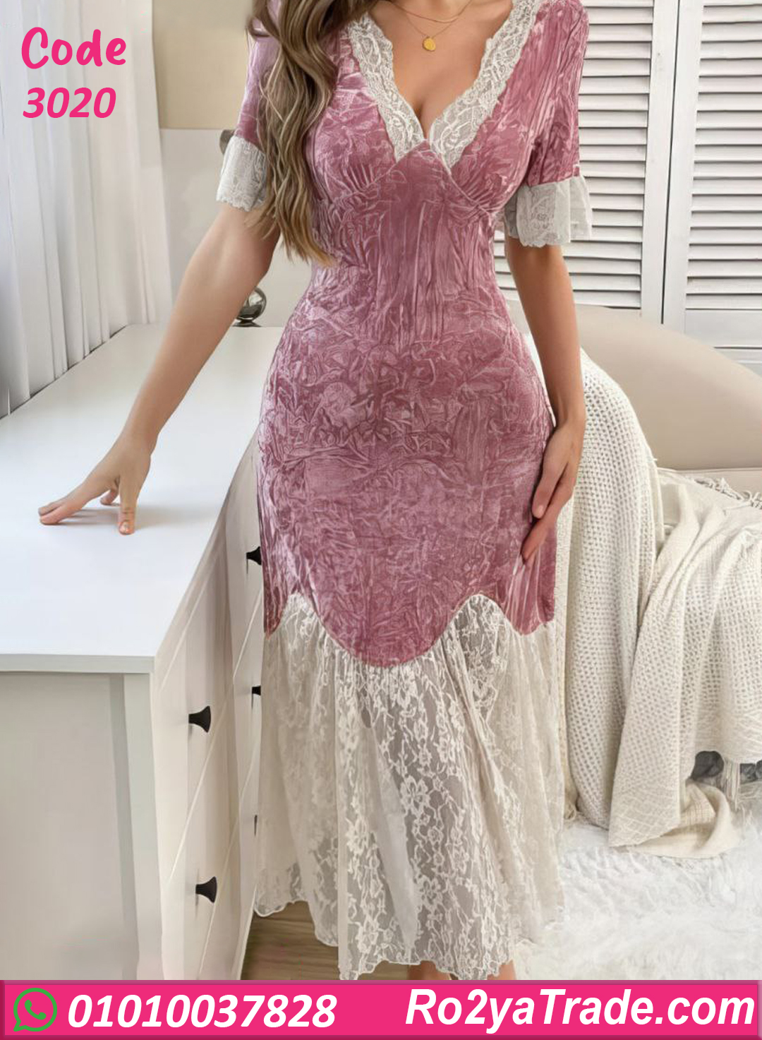 الست اللي بتحب الأناقة حتى وهي في البيت. الخامة مخمل مضغوط ناعم على الجسم وبيوفر إحساس بالدفا والراحة، مع تفاصيل دانتيل أنثوية بتدي لمسة فخامة وشياكة