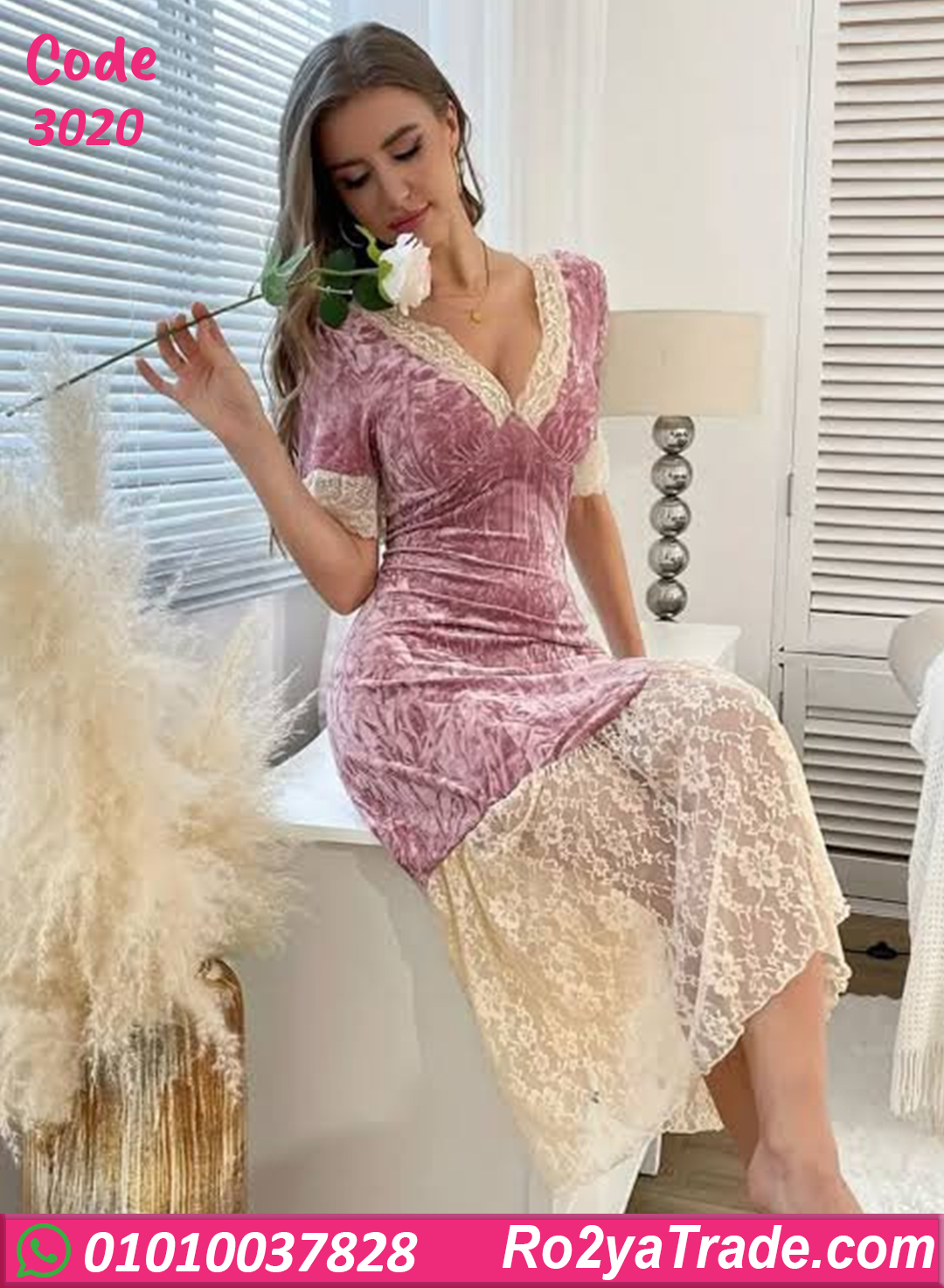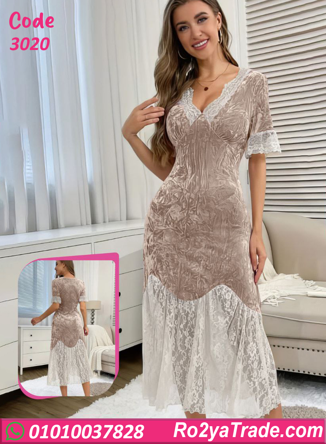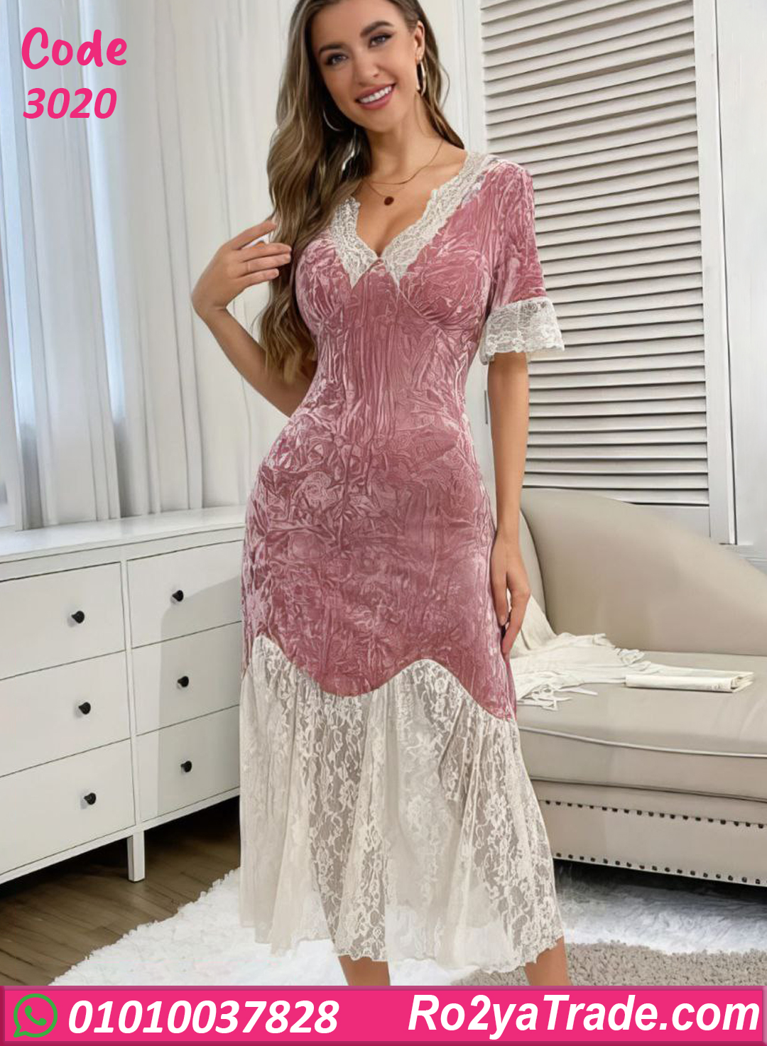 الست اللي بتحب الأناقة حتى وهي في البيت. الخامة مخمل مضغوط ناعم على الجسم وبيوفر إحساس بالدفا والراحة، مع تفاصيل دانتيل أنثوية بتدي لمسة فخامة وشياكة
