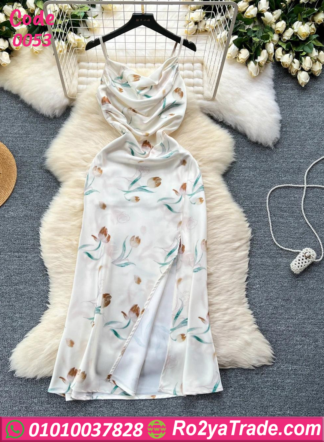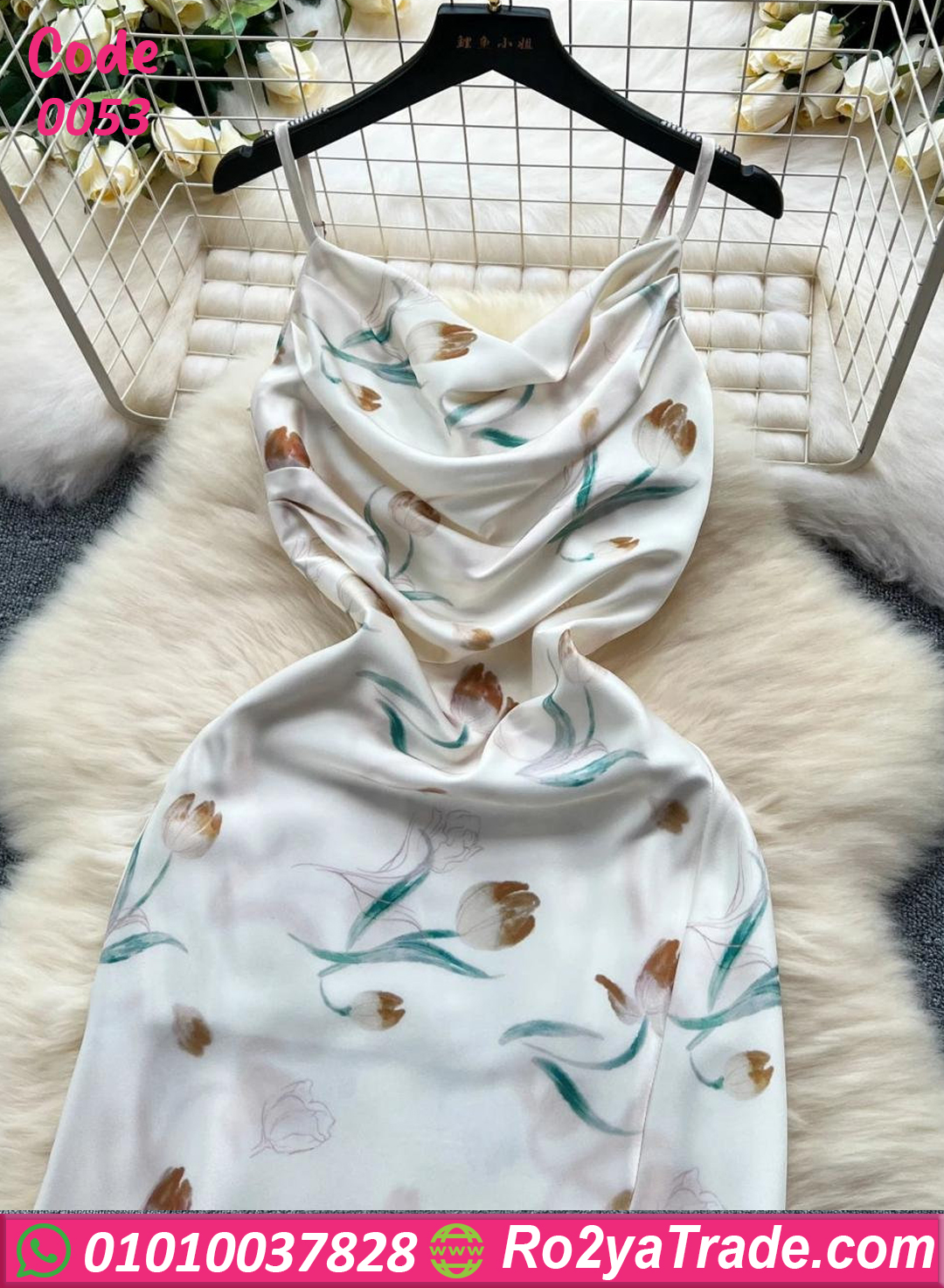 الموديل باللون الأبيض اللامع مع نقشة ورد وأوراق بلون هادي، تصميمه بسيط بانسيابية جذابة بفتحة خفيفة من الأمام تضيف لمسة دلع وشياكة.