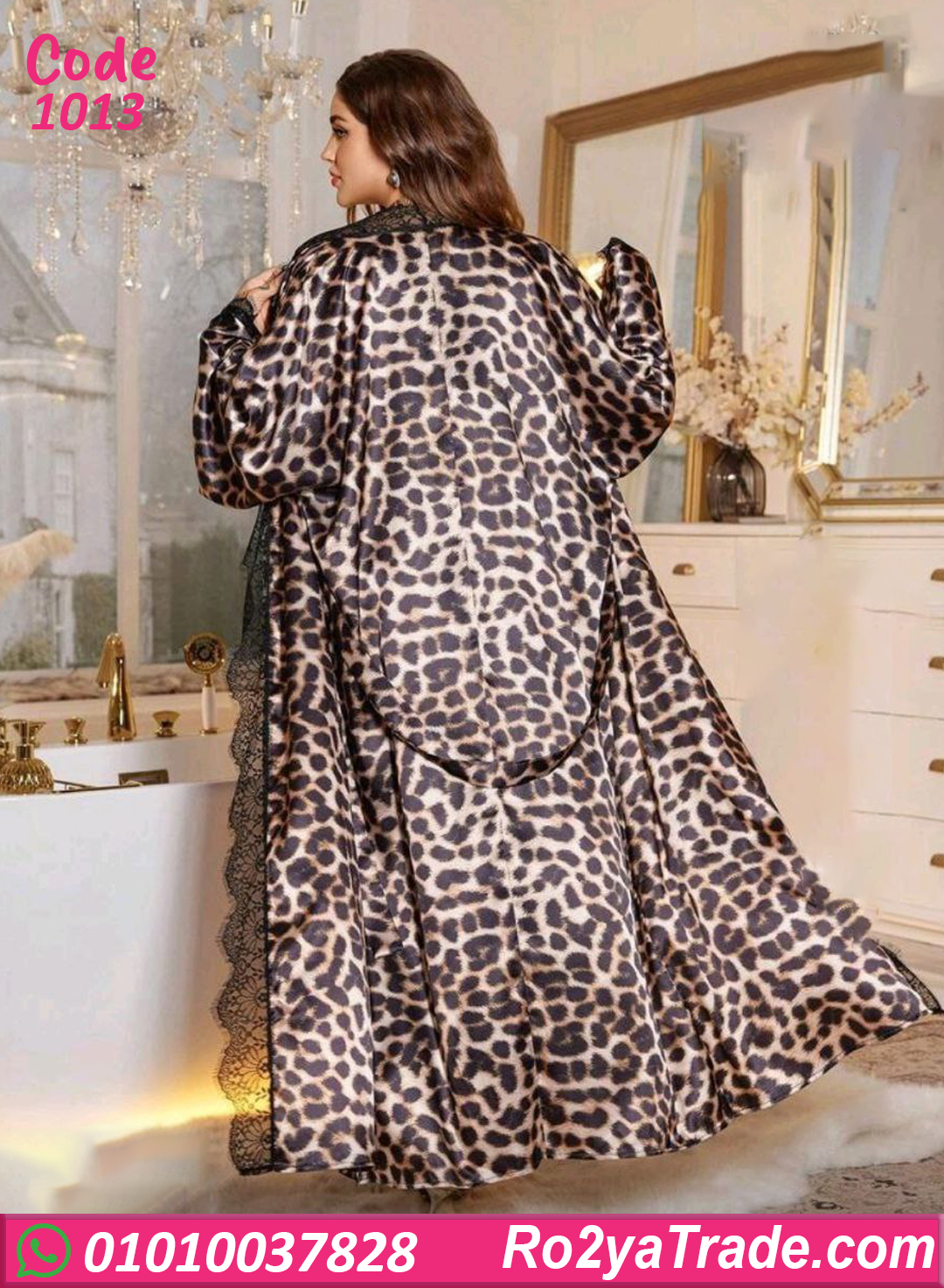 التصميم مكوّن من فستان داخلي ناعم مع روب خارجي واسع بنفس نقشة التايجر ولمسة دانتيل أنيقة بتدي شكل فخم ودلع.