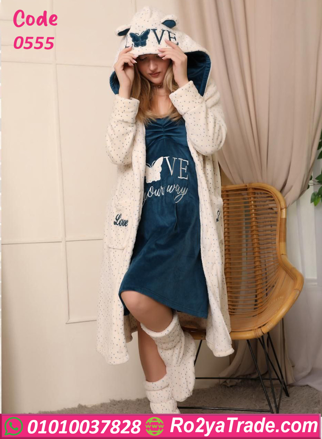 خامة قطيفة تقيلة ودافية جدًا تناسب أجواء الشتاء الباردة. التصميم أنثوي ومريح في نفس الوقت، الفستان بسيط والروب مزوّد بكابيشو شيك يدي شكل جذاب ودفا إضافي.