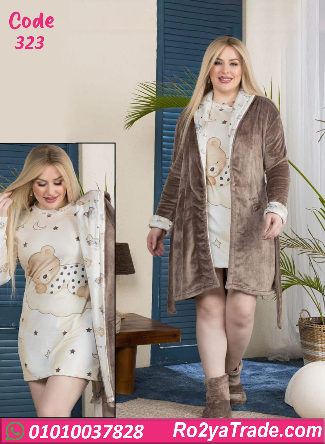 التصميم مكوّن من قميص نوم بطبعة لطيفة ومعاه روب شتوي فرو ناعم بحزام بيدي دفا إضافي ولمسة شيك.