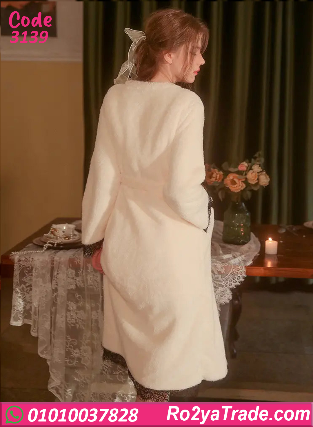 التصميم مكوّن من قطعتين، فستان داخلي أنيق بقصة ناعمة مع روب خارجي دافي، مزين بتفاصيل لطيفة بتدي شكل راقي ومريح.