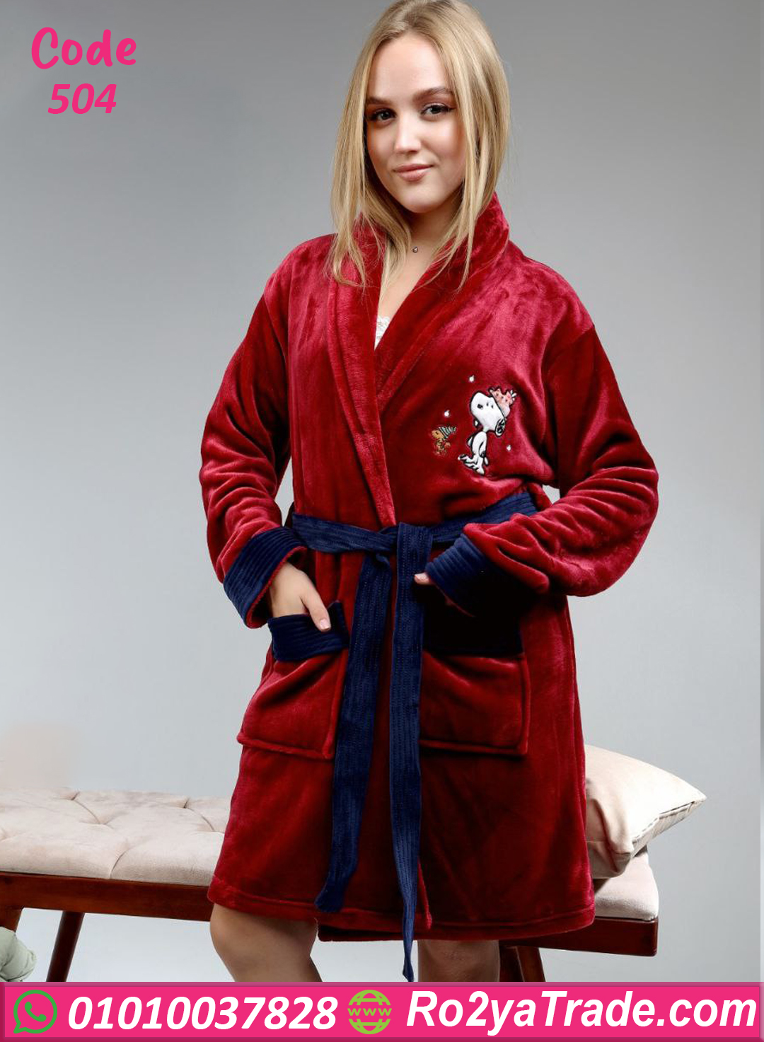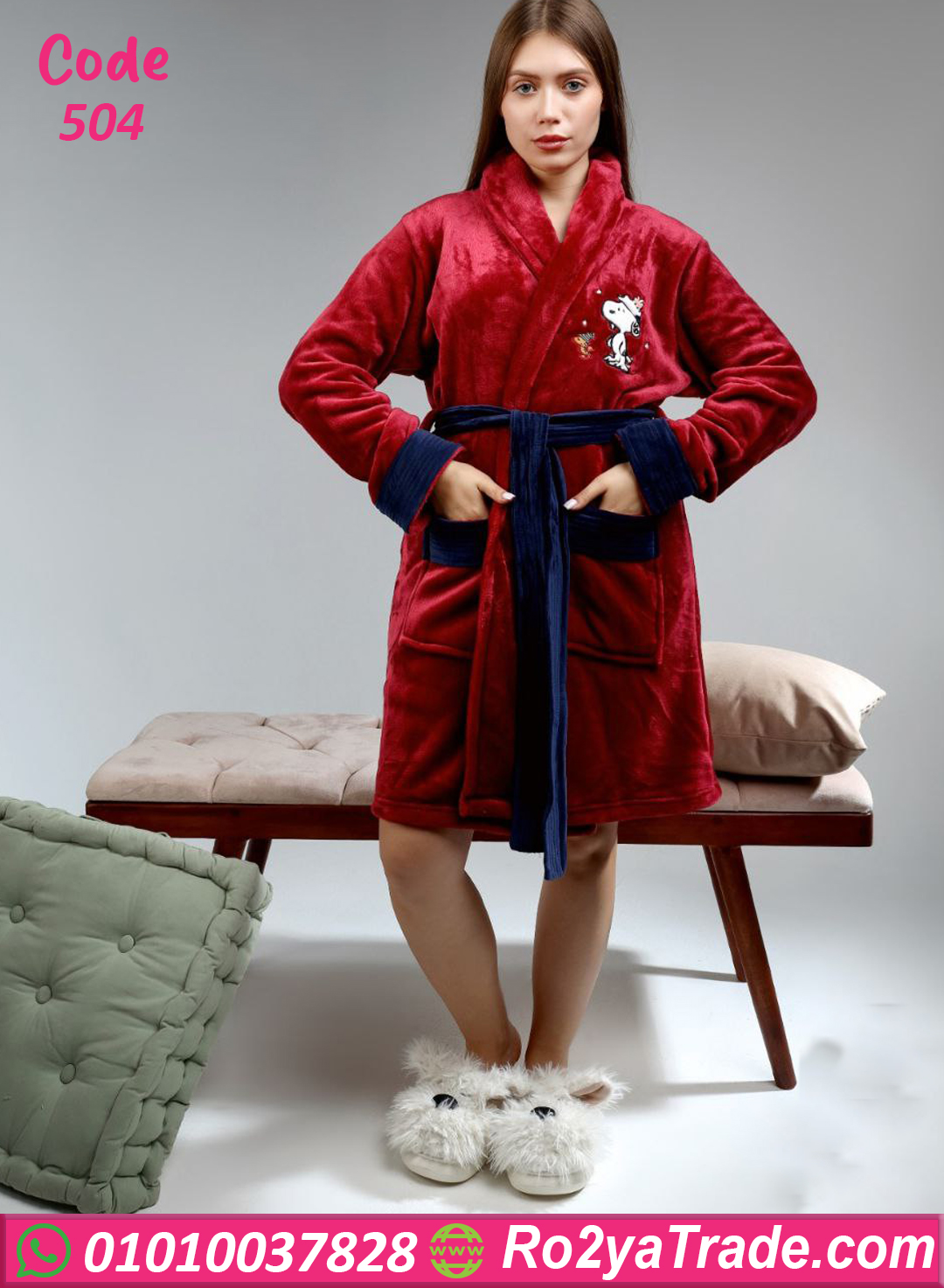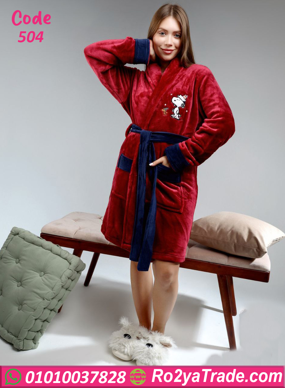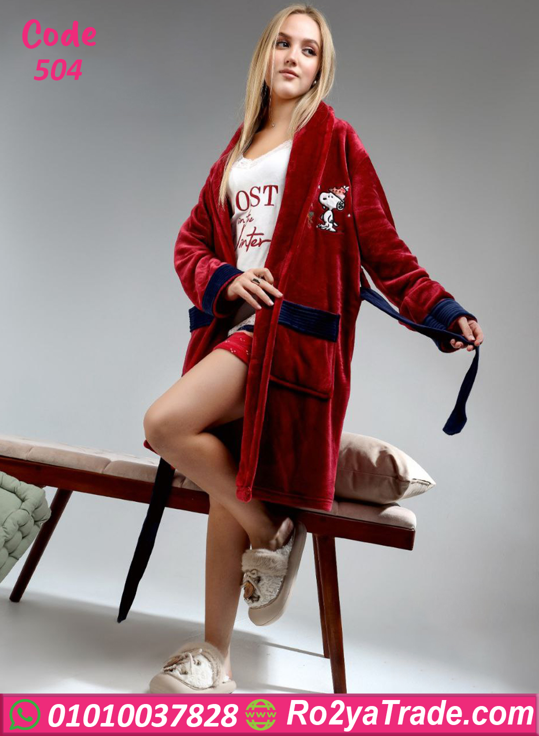 مع روب أحمر طويل بخامة قطيفة سميكة تضيف لمسة من الفخامة والدفء. الموديل عملي جدًا ومناسب لفصل الشتاء