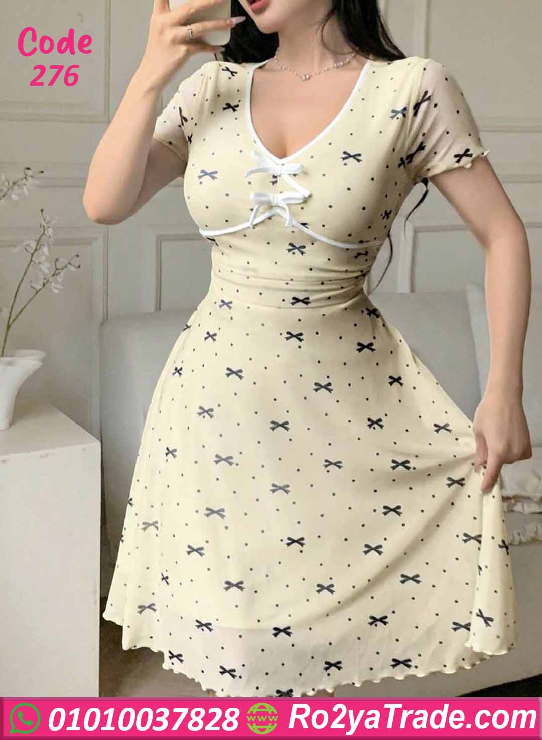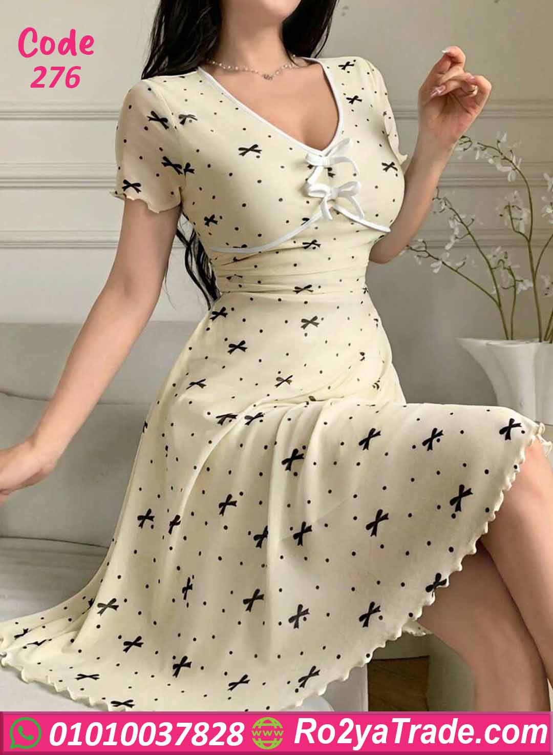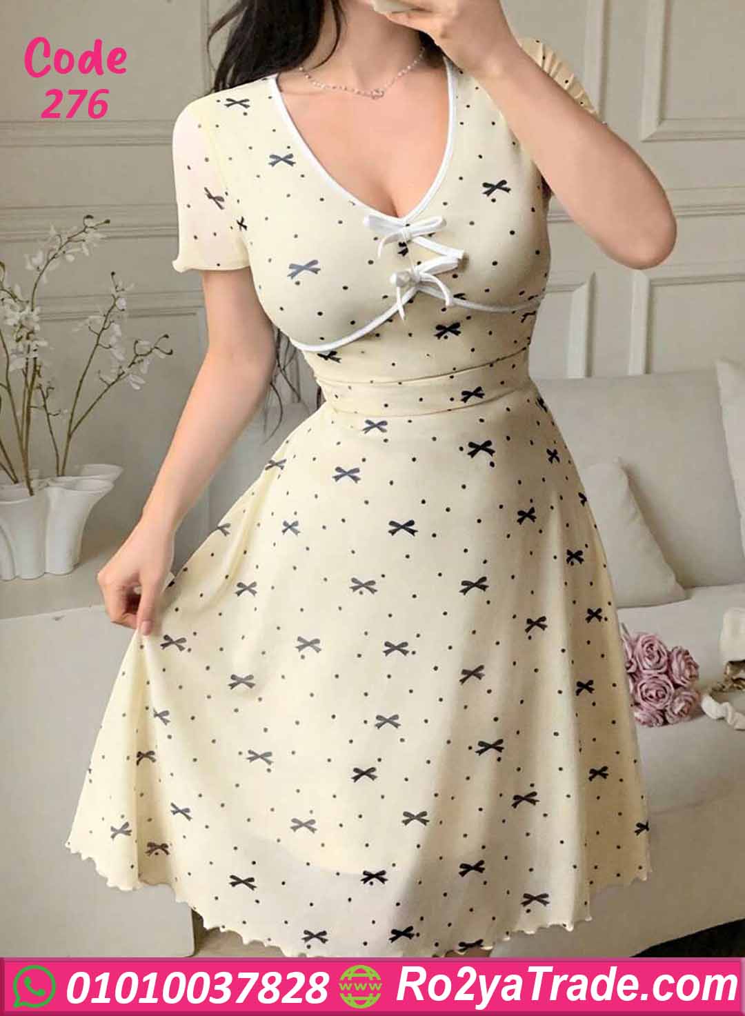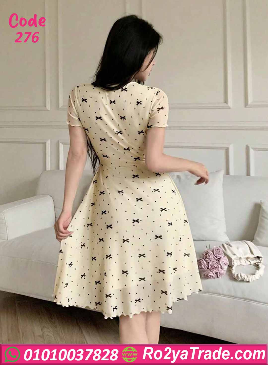 الموديل يتميز بتصميم جذاب مع طبعة فيونكات صغيرة موزعة على الفستان تعطيه شكل ناعم وأنثوي يناسب الأجواء الصيفية.