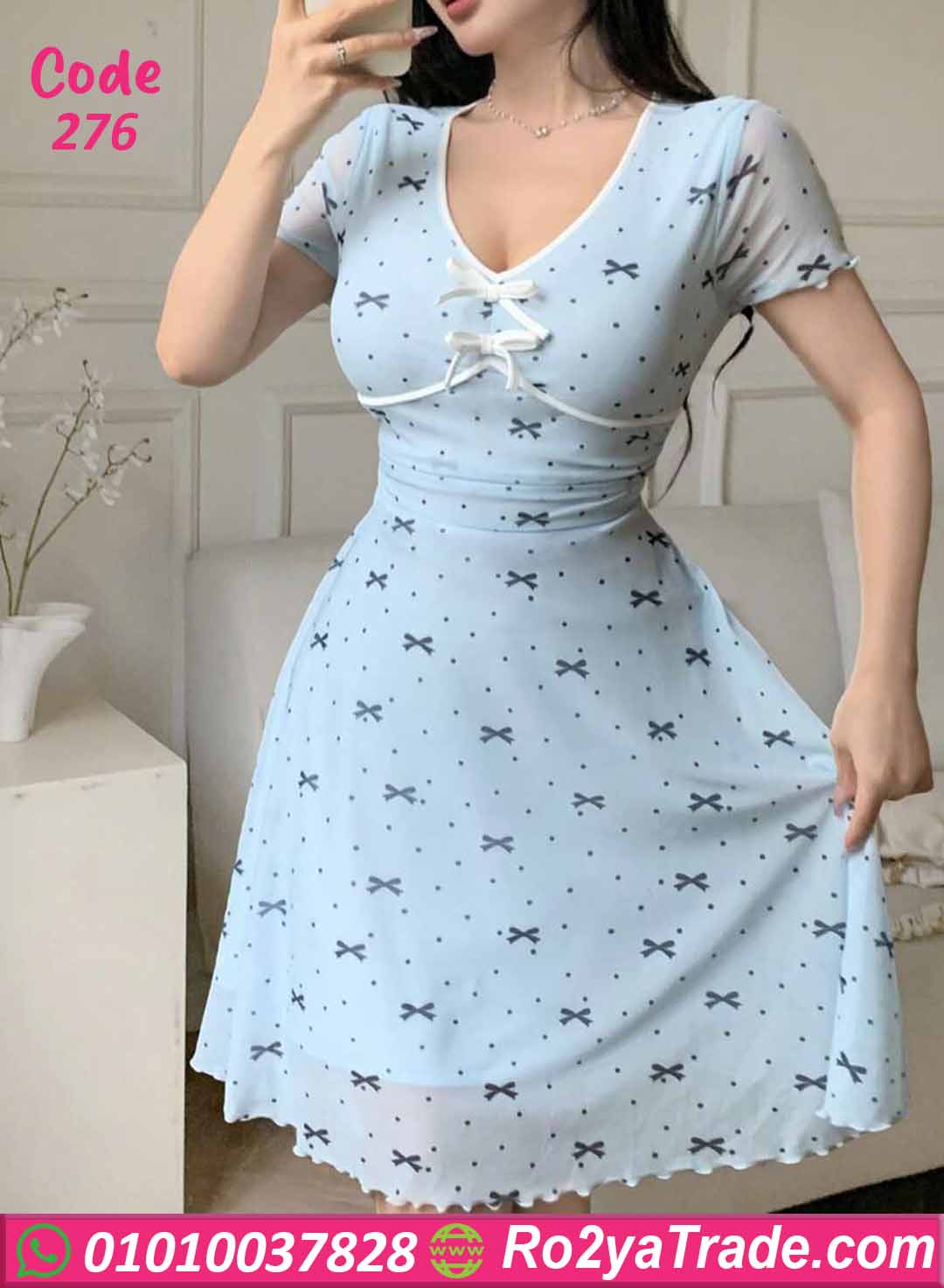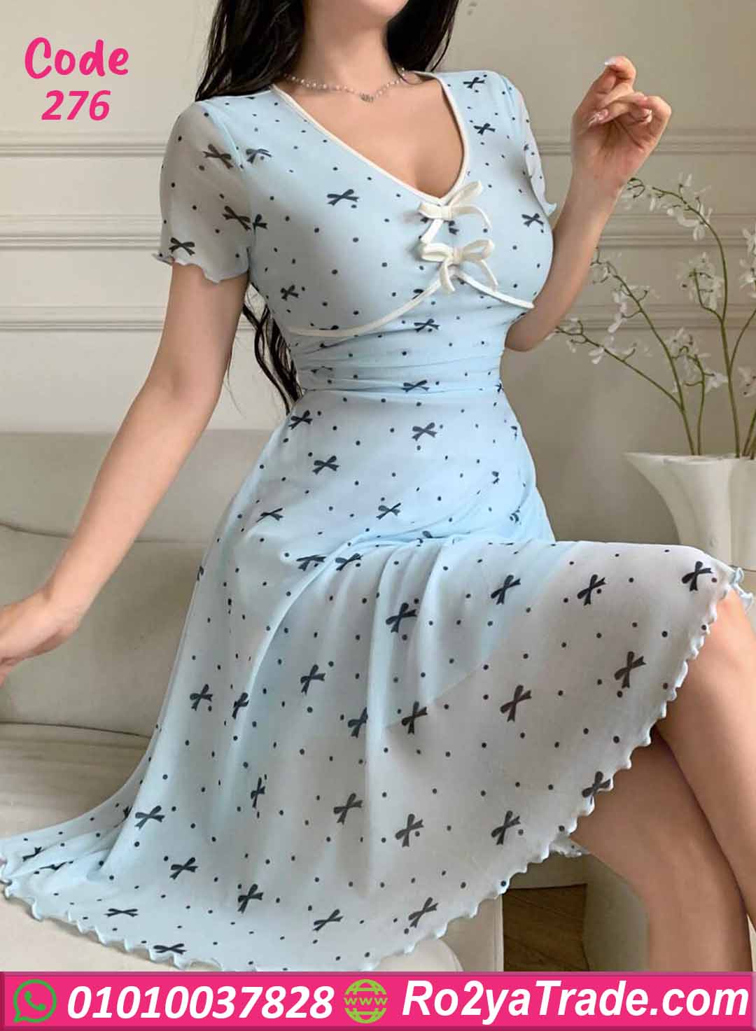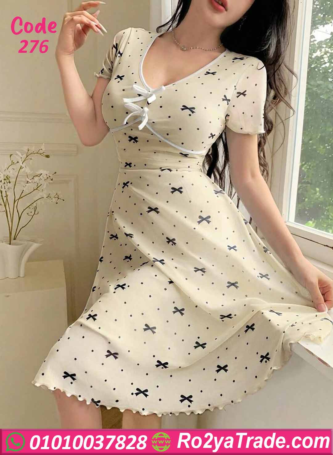 الموديل يتميز بتصميم جذاب مع طبعة فيونكات صغيرة موزعة على الفستان تعطيه شكل ناعم وأنثوي يناسب الأجواء الصيفية.