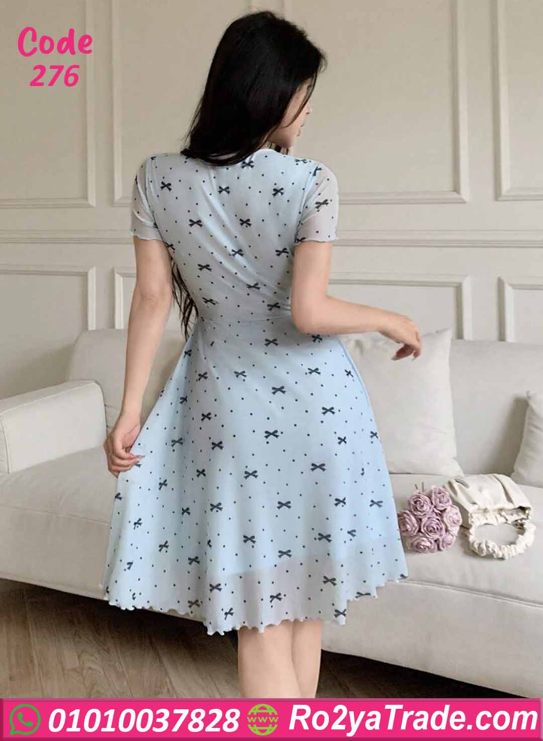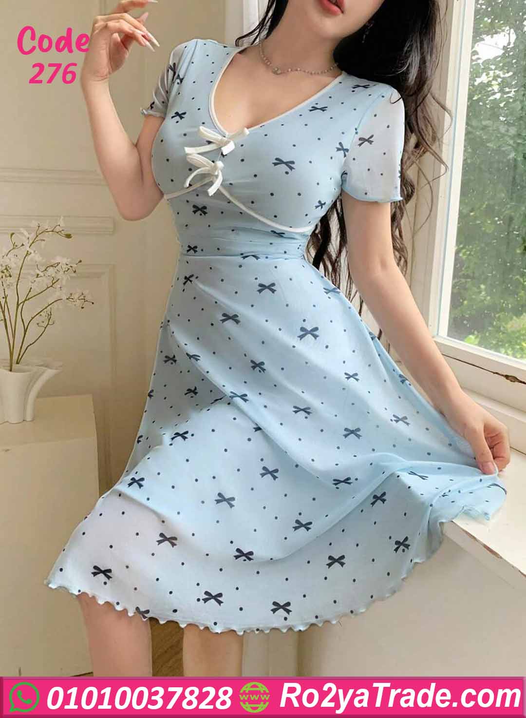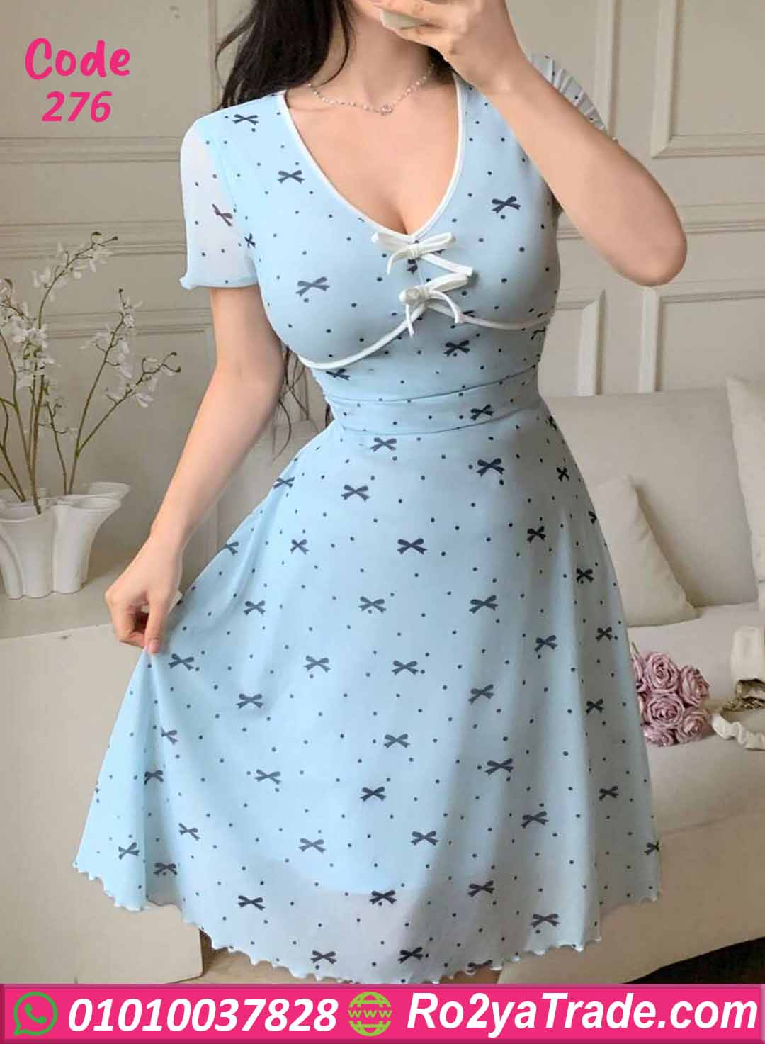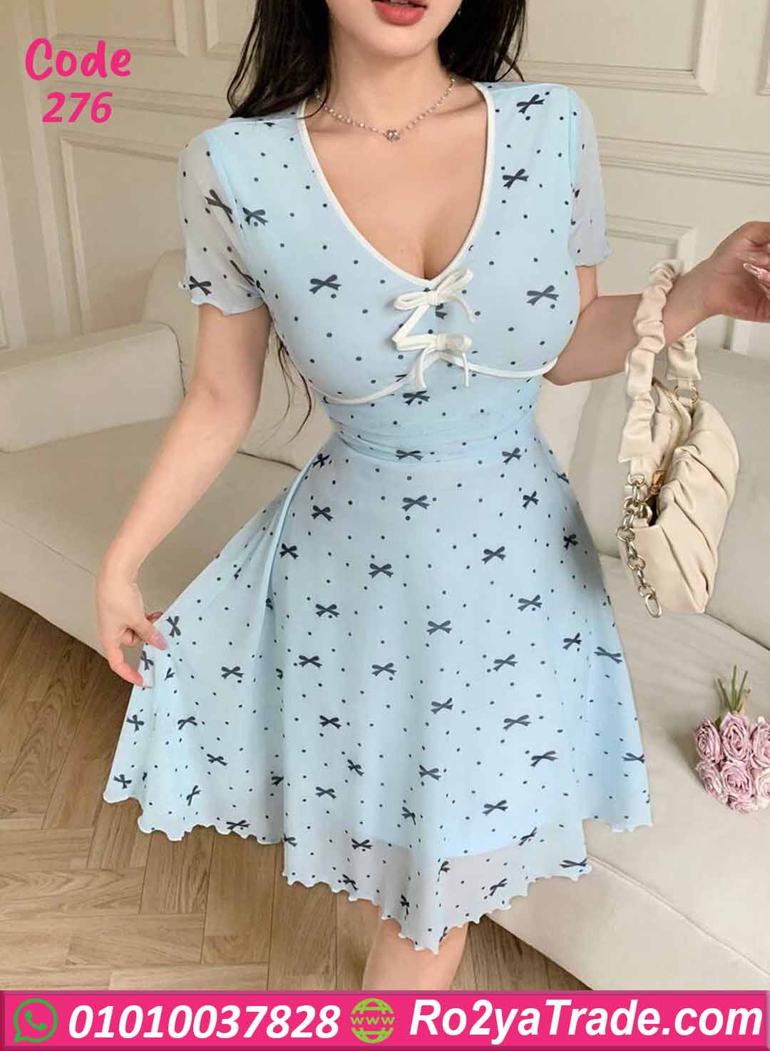 الموديل يتميز بتصميم جذاب مع طبعة فيونكات صغيرة موزعة على الفستان تعطيه شكل ناعم وأنثوي يناسب الأجواء الصيفية.