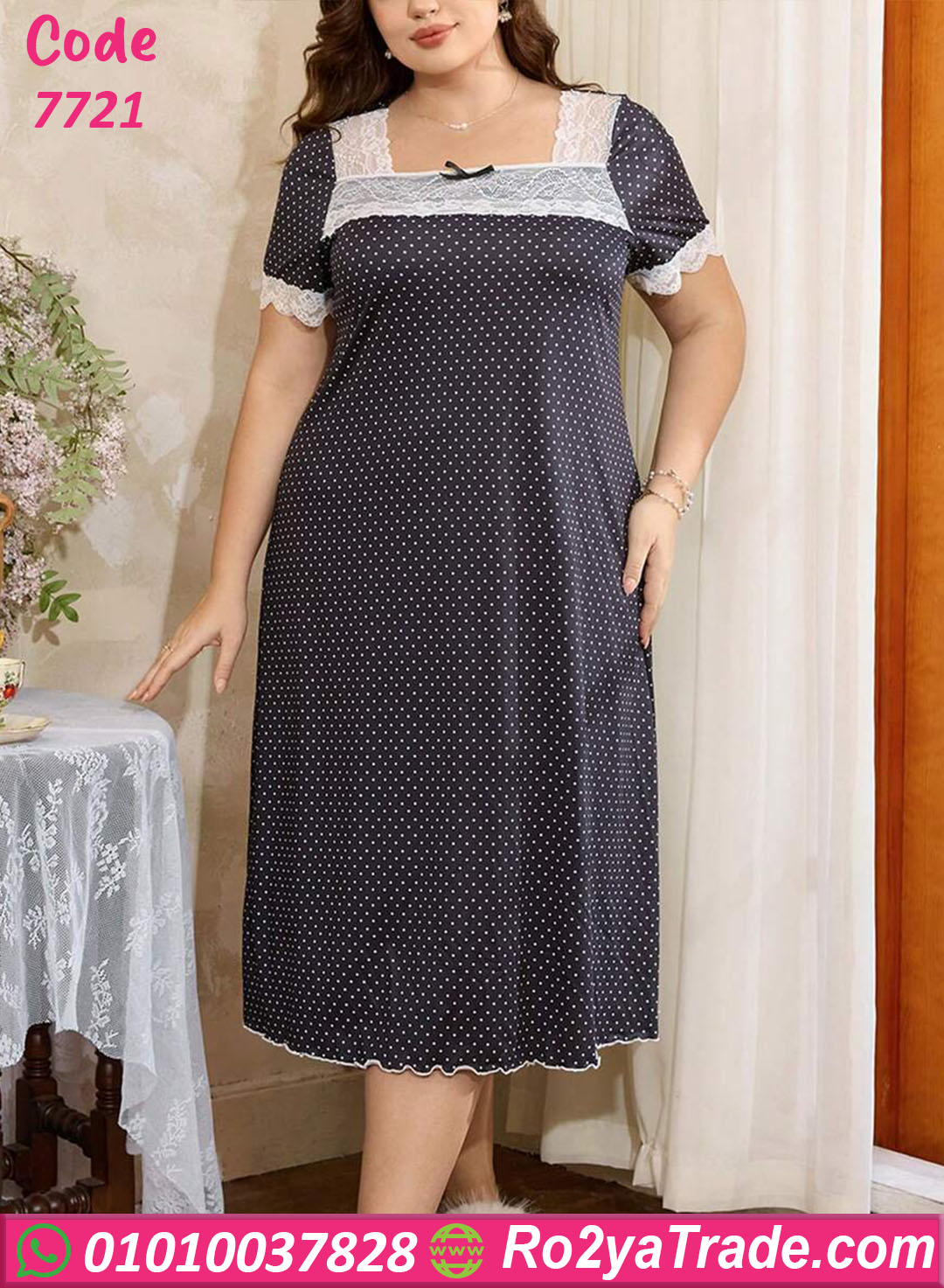 كاش نسائي صيفي بتصميم مريح وأنيق بنقشة نقاط مع تفاصيل دانتيل ناعمة يمنحك إطلالة أنثوية مريحة داخل المنزل.