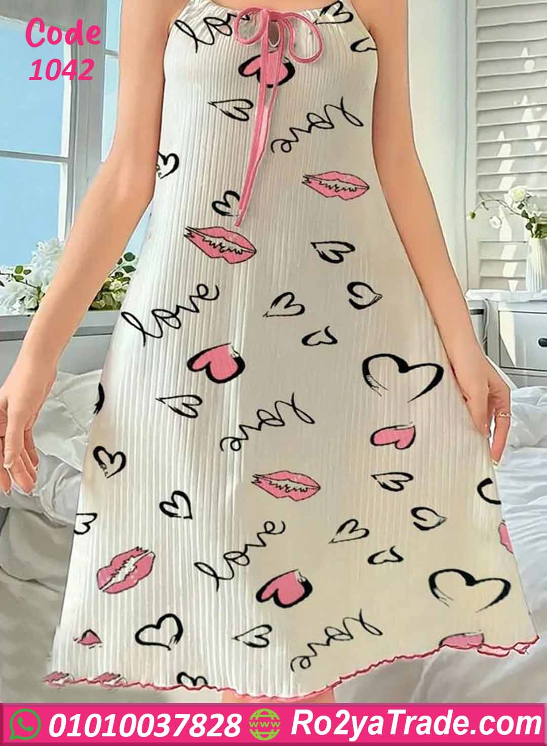 بحمالات رفيعة مع رباط وردي قدام لمسة أنثوية مميزة. النقشة عبارة عن قلوب بألوان أسود ووردي مع رسومات شفايف وكلمة Love موزعة بشكل عشوائي على أرضية فاتحة،