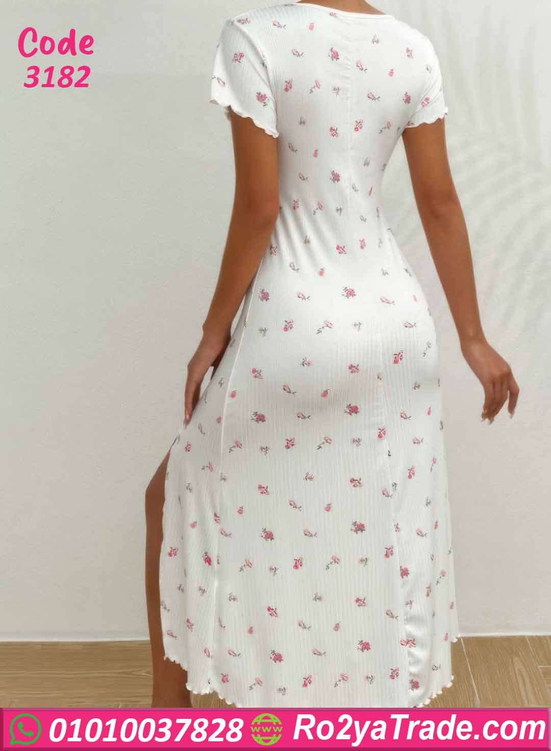 الجزء العلوي يأتي بقصة مريحة مع أكمام قصيرة ونقشة ورد صغيرة تضيف طابع رقيق وناعم، مما يجعله مناسبًا للإطلالات الصيفية الهادئة.