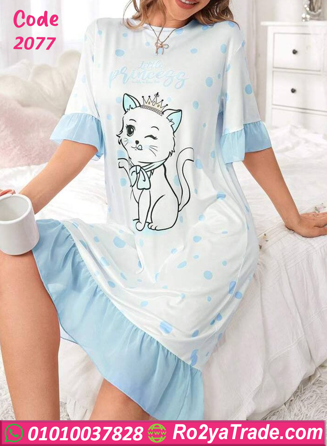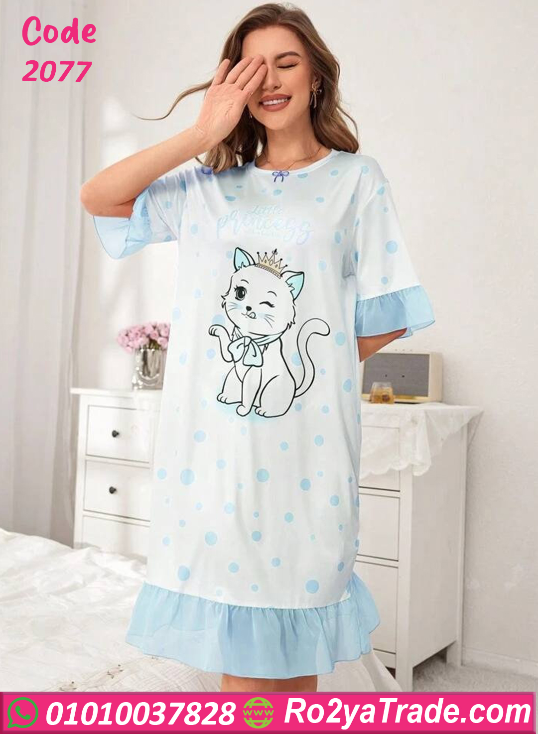 كاش مايوه بيتي صيفي بخامة قطن خفيفة ولطيفة، عليه رسمة كيوت لقطة تاج، ستايل ناعم ومريح للنوم أو البيت.