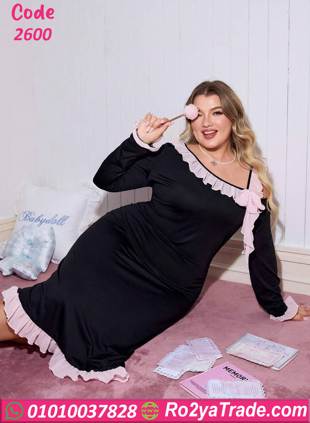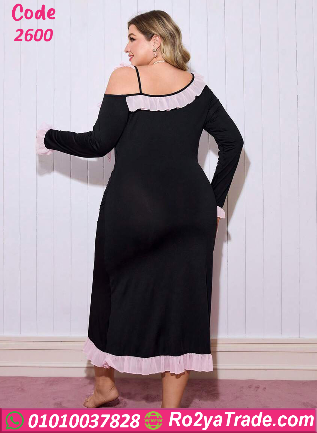 وكتف مكشوف يضيف لمسة عصرية أنيقة. كما يأتي بتفاصيل كشكشة ناعمة بلون متباين حول الرقبة والكتف تضيف لمسة أنثوية رقيقة تعطي للموديل شكل مميز وجذاب.