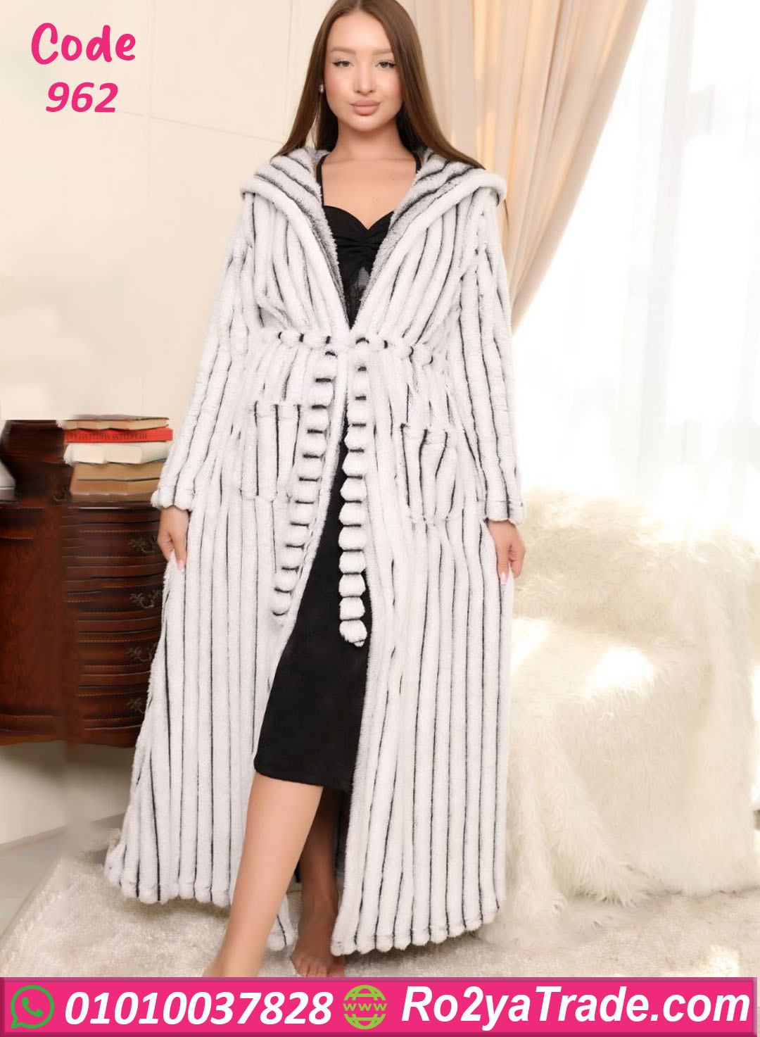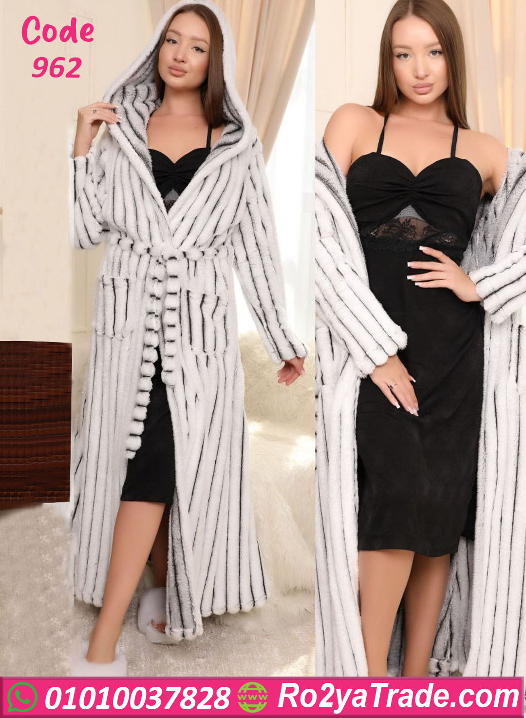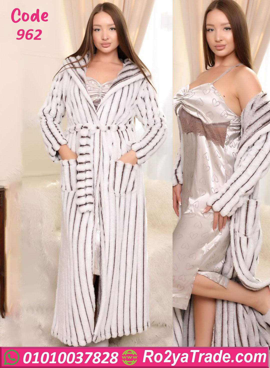 طقم شتوي فخم بخامة القطيفة الناعمة، تصميم أنيق مكوَّن من فستان لانجري طويل وروب فرو دافئ جدا، للمسة دلع ودفا في الشتاء.