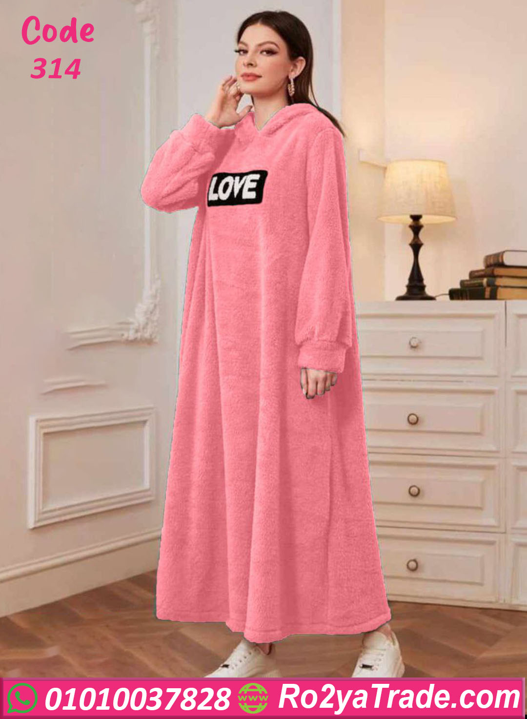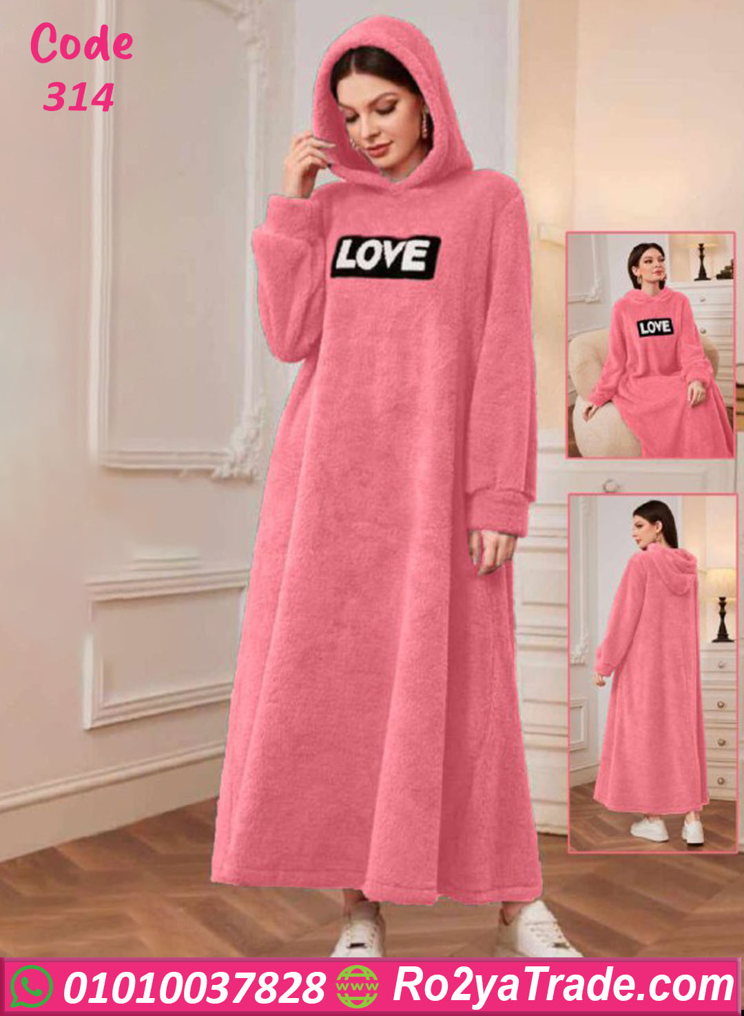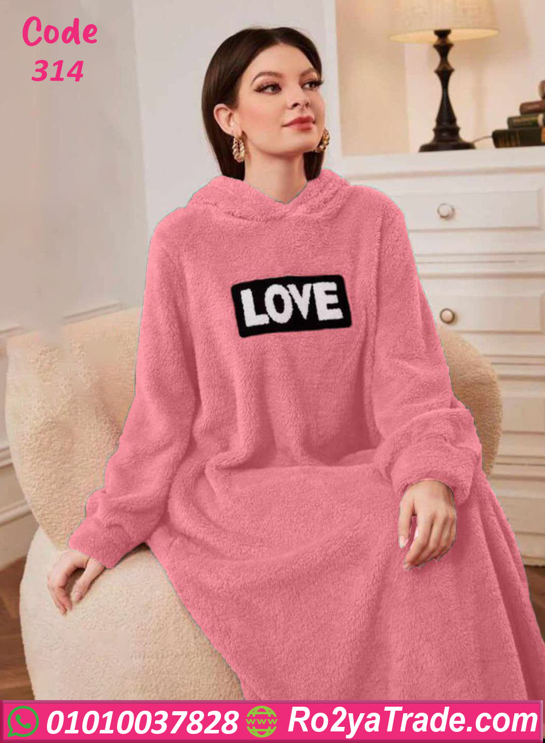 “LOVE” بتطريز ناعم في المنتصف. فيه كابيشو علشان تحميكي من البرد بخامة خفيفة وملمس مريح على الجلد. مثالي للبيت أو بعد الحمام في الأيام الباردة. الموديل بيجمع بين البساطة والرقة،
