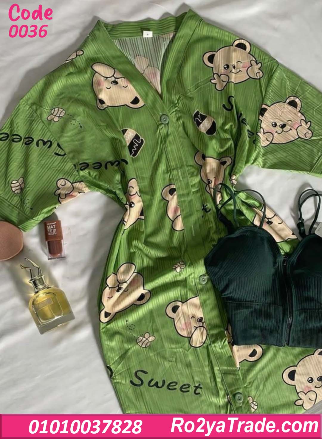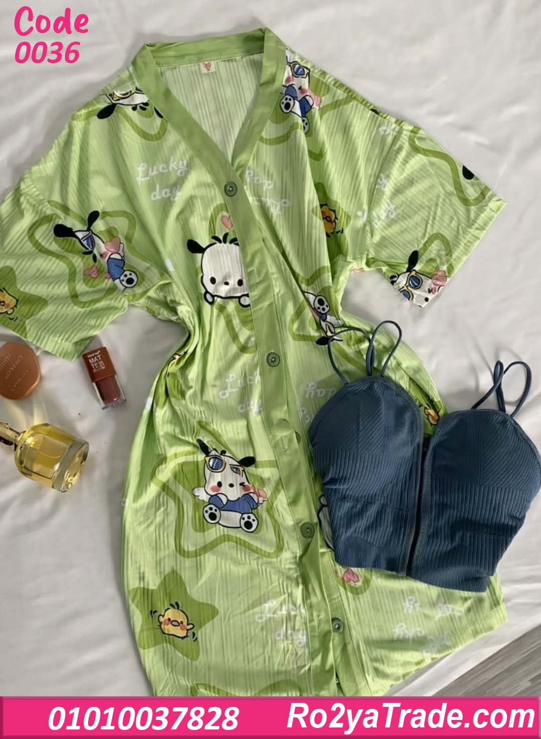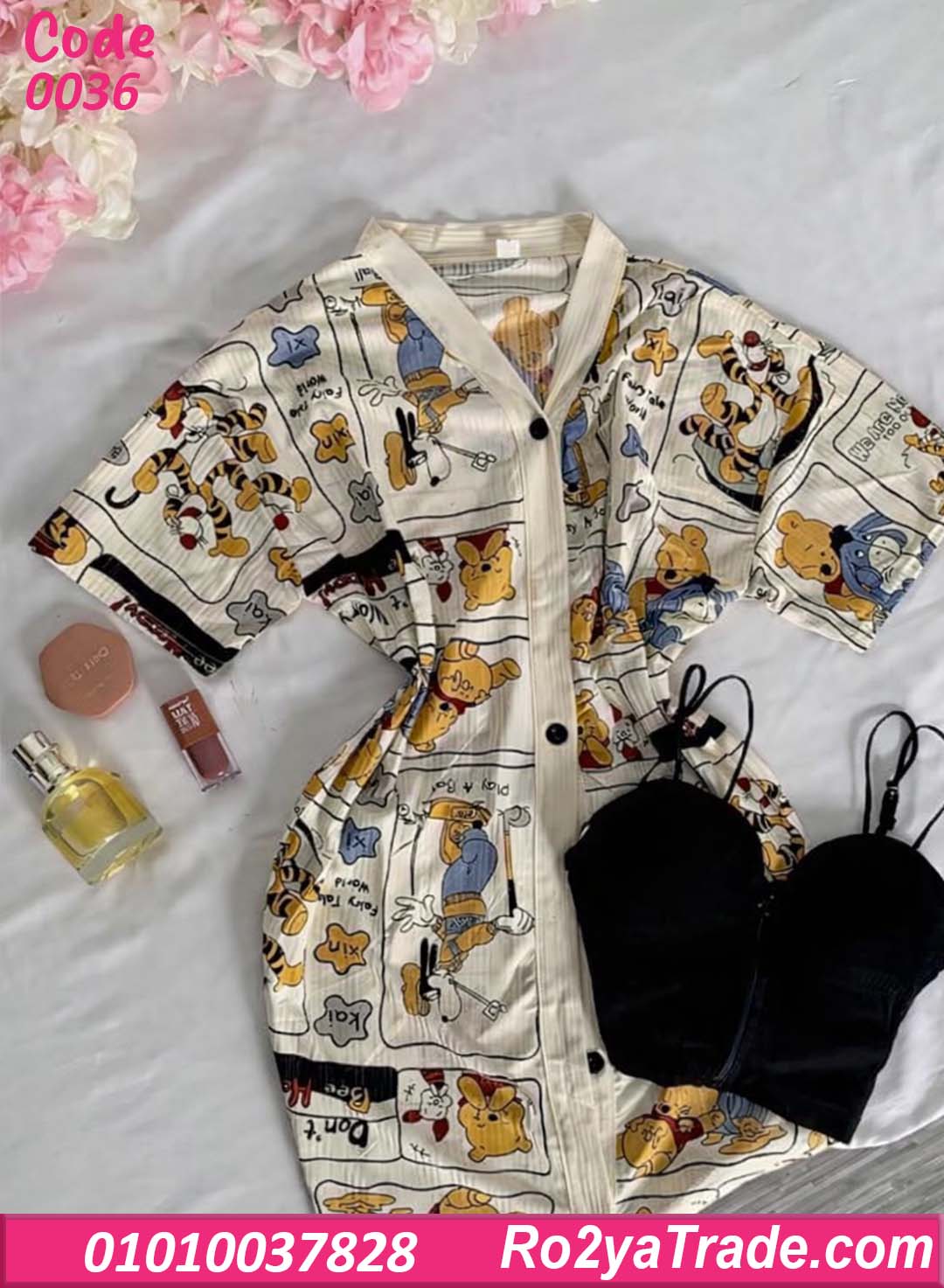 يتميز التصميم بنقشات كرتونية جذابة تضيف لمسة شبابية لطيفة تجعل الموديل مختلف ومميز عن باقي موديلات ملابس البيت الصيفية.